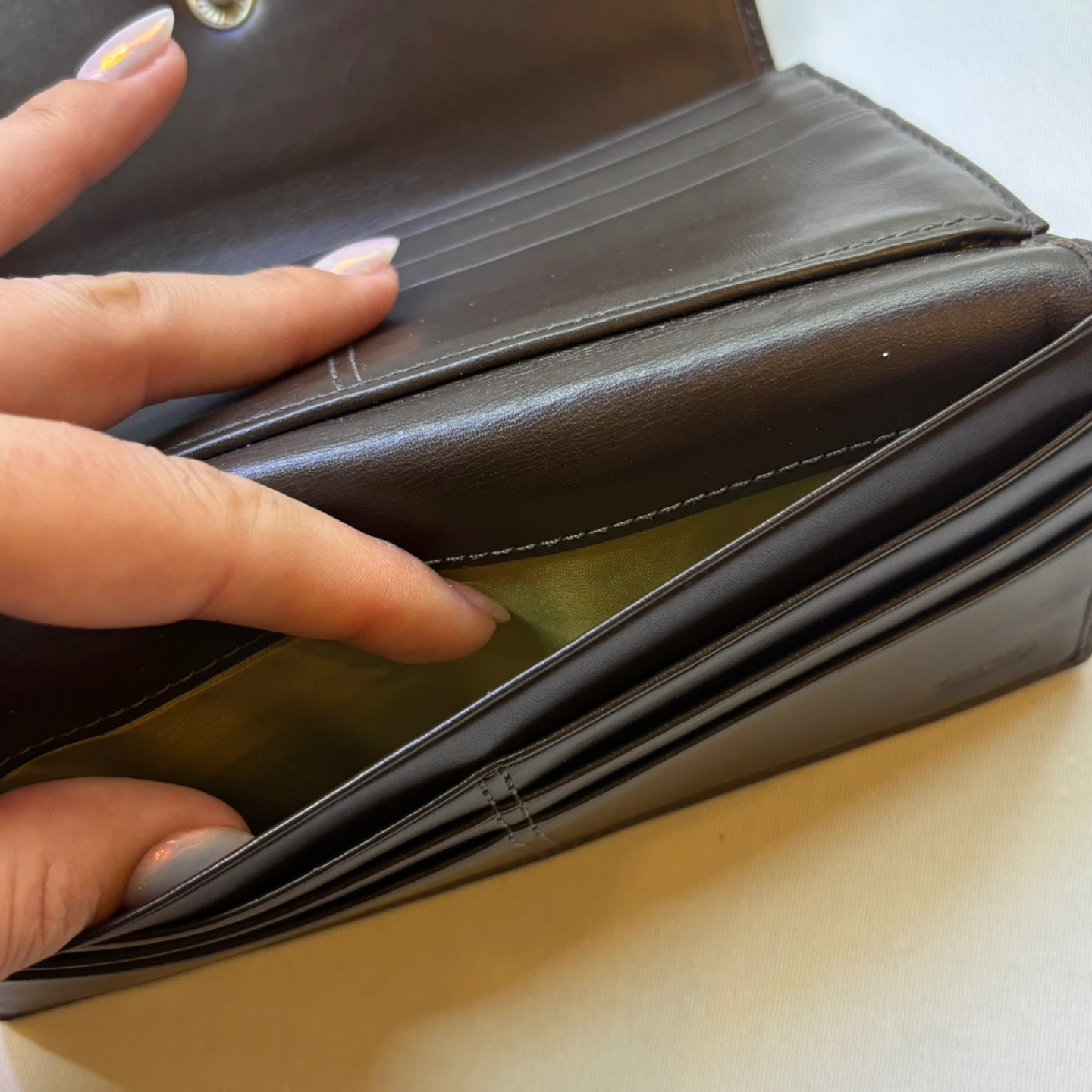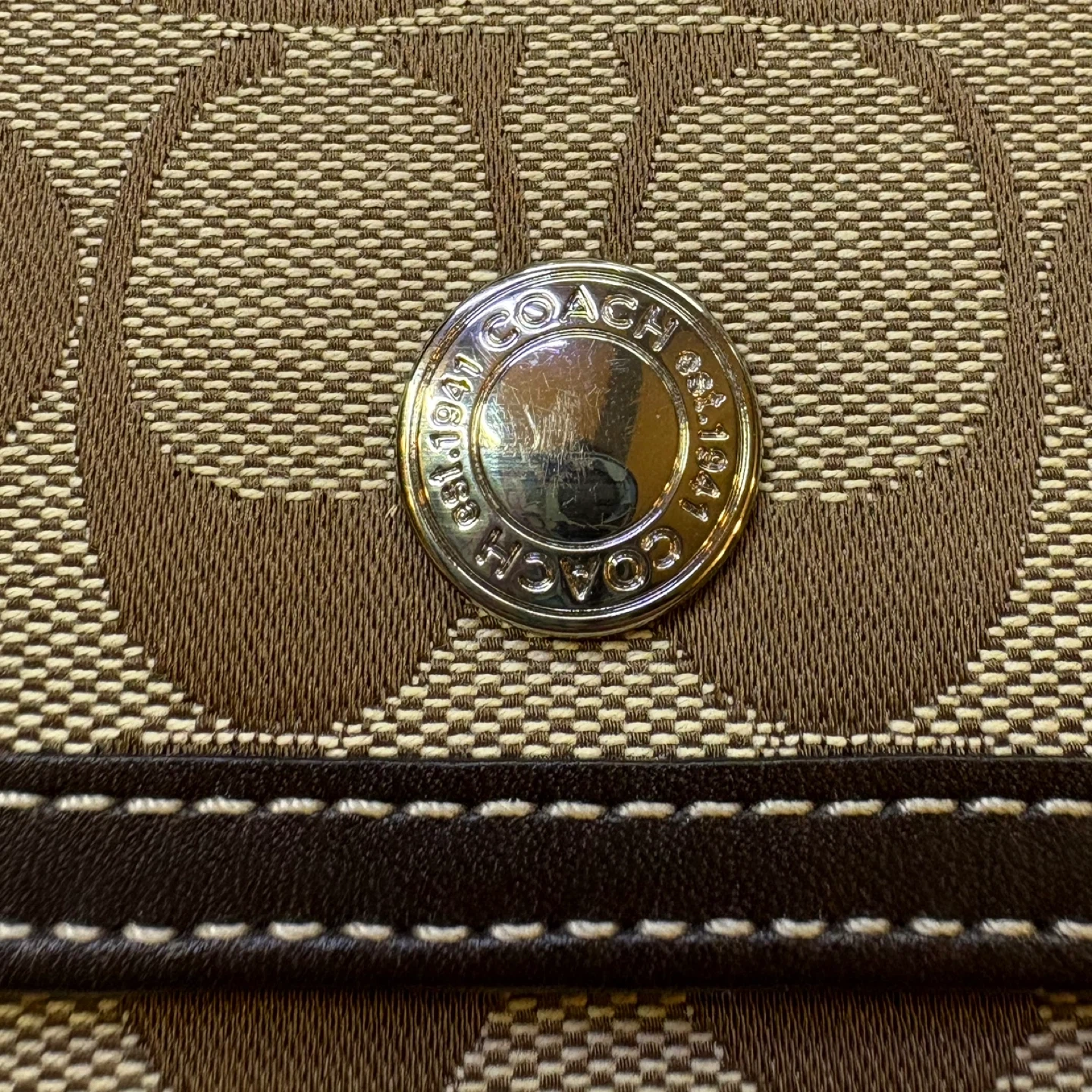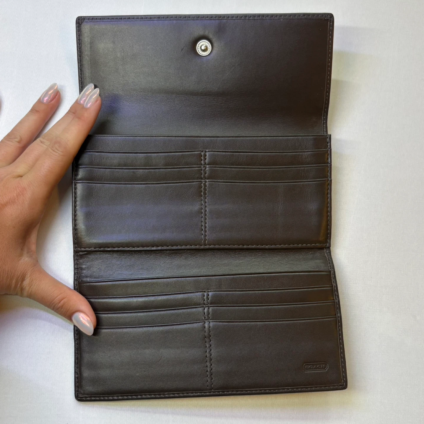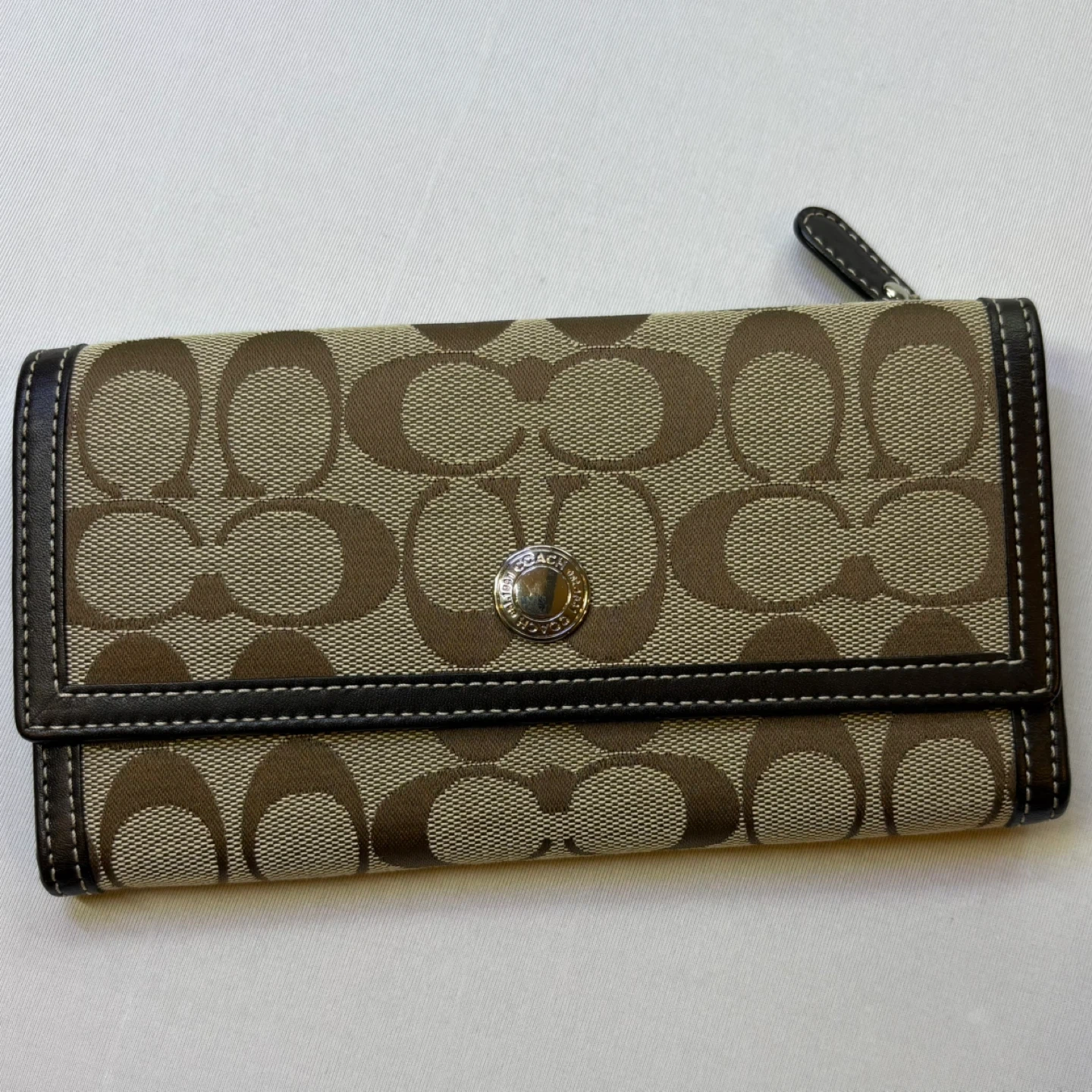 122Classic Coach trifold wallet featuring the brand’s signature “C” logo canvas with chocolate brown leather trim and interior. Includes multiple card slots, full-length bill compartments, and a secure snap closure. Compact yet spacious design—ideal for everyday use or travel. Brand: Coach Era: Contemporary Color: Brown / Tan Print: Signature “C” logo Material: Coated canvas and leather Condition: Excellent pre-owned condition Size: Approx. 7.5” W x 4” H (closed) See photos for measurements. Flaws: None noted Cross posted. Keywords: Coach wallet, trifold wallet, signature canvas, brown logo wallet, designer wallet, Coach accessories, Coach purse wallet, women’s wallet, leather trim wallet, Coach Canada Winnipeg - Pick up only (Located 2 blocks west of Polo Park). Shipping options available through other platforms message me for details.