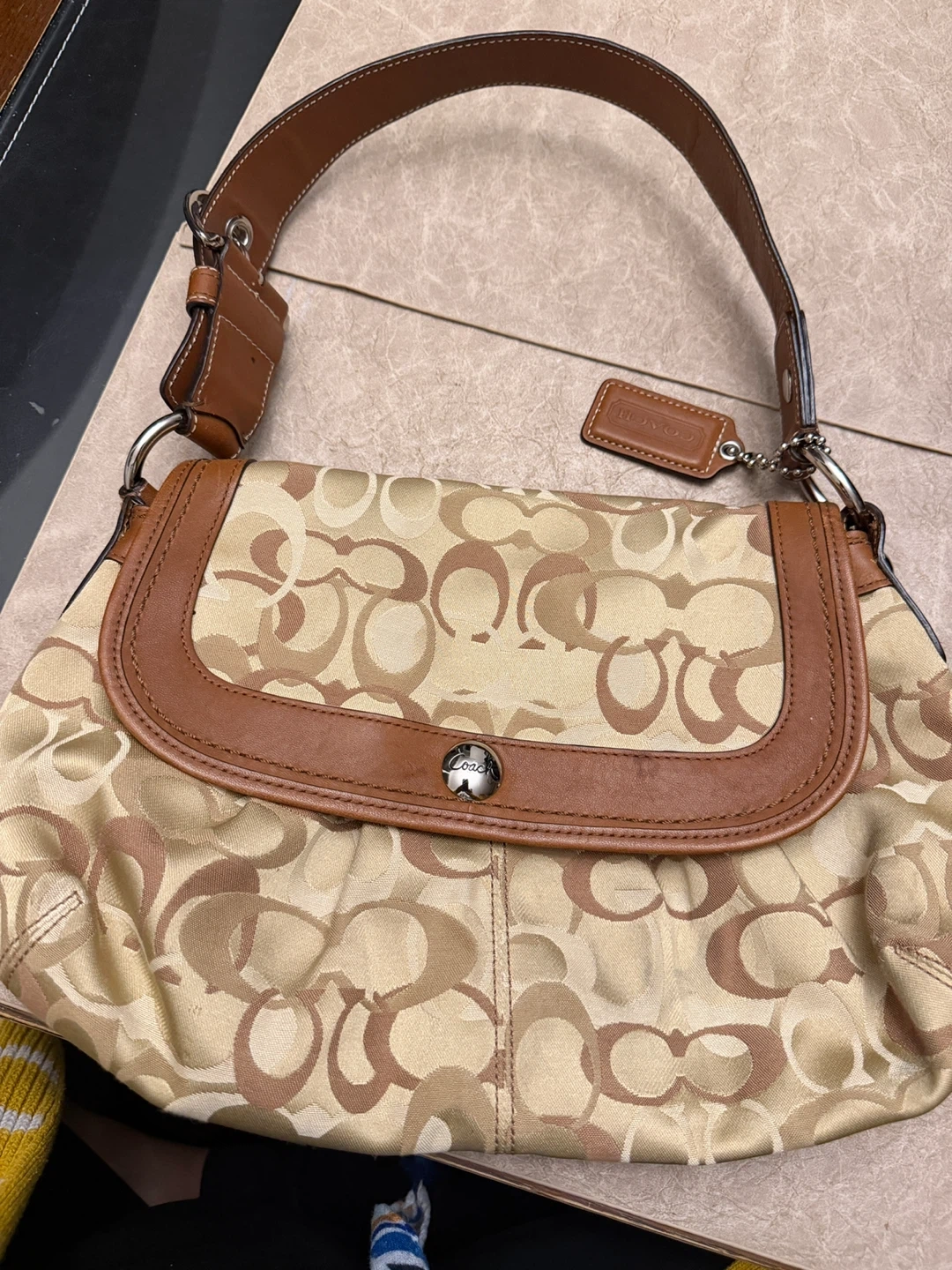Selling a Coach handbag with the iconic signature canvas pattern and brown leather trim. It's in great condition and ready for a new home!