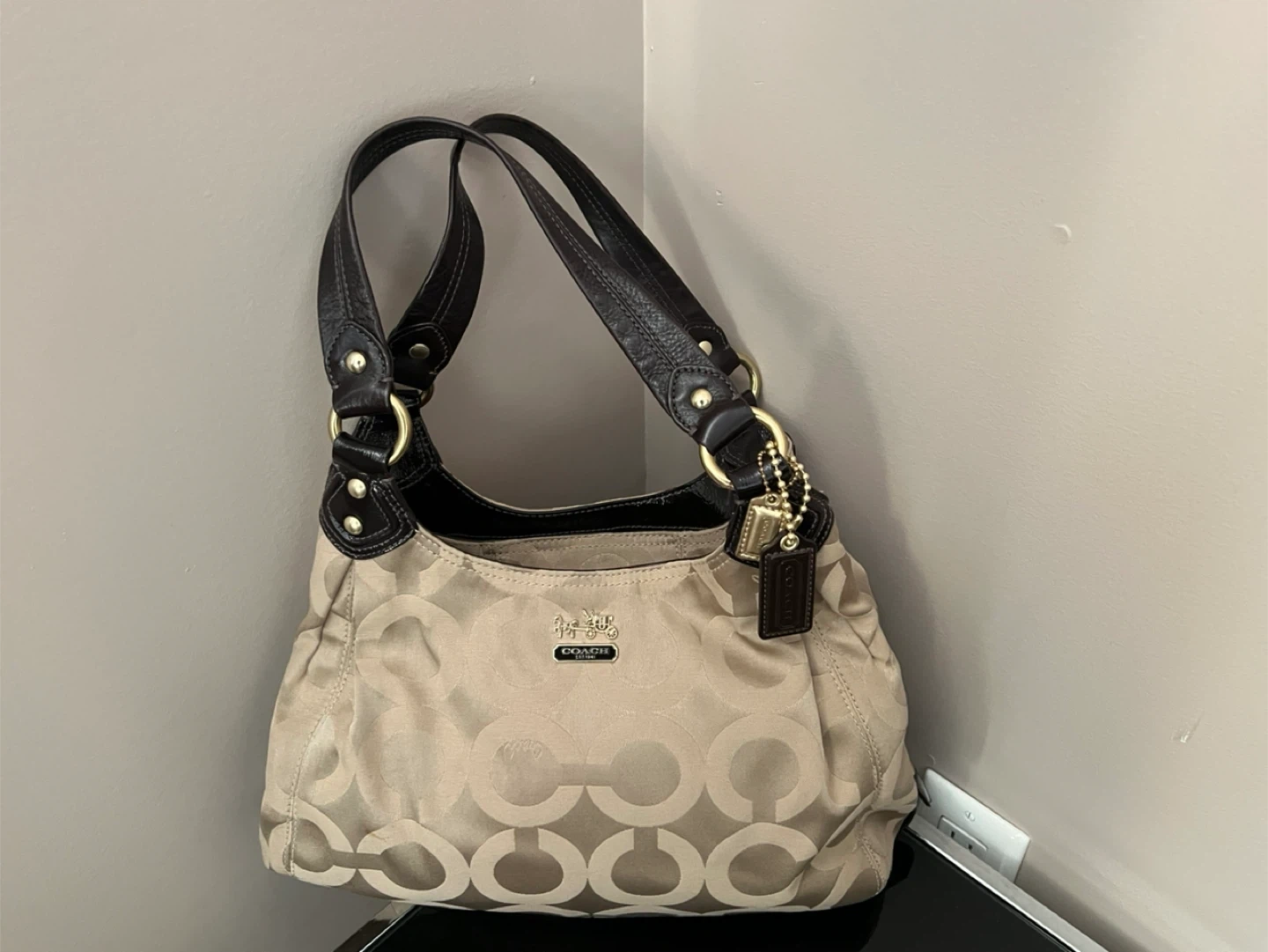 Selling a gently used Coach hobo bag! It features the classic Coach signature pattern in a neutral colour, complemented by dark brown leather straps and trim. Perfect for everyday use!