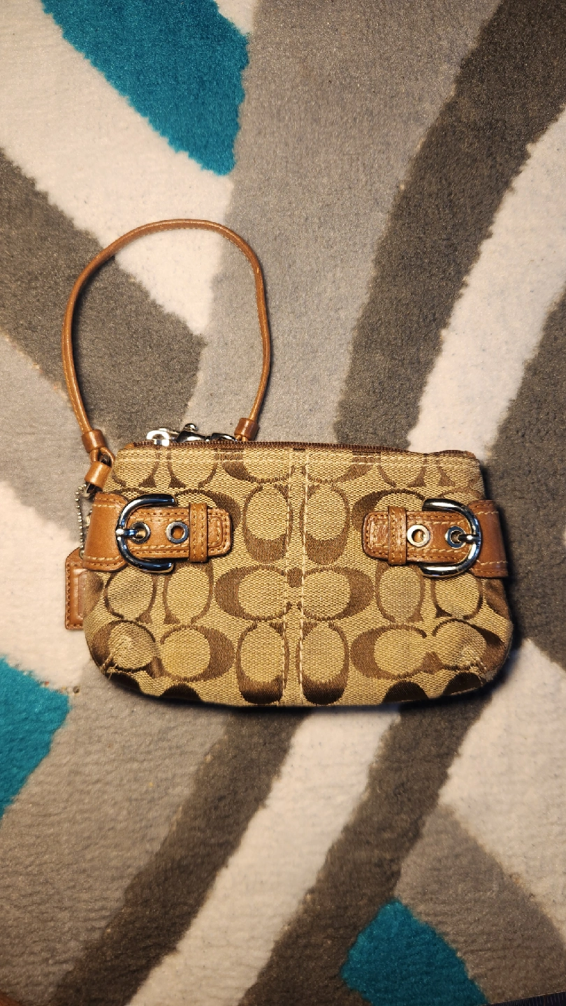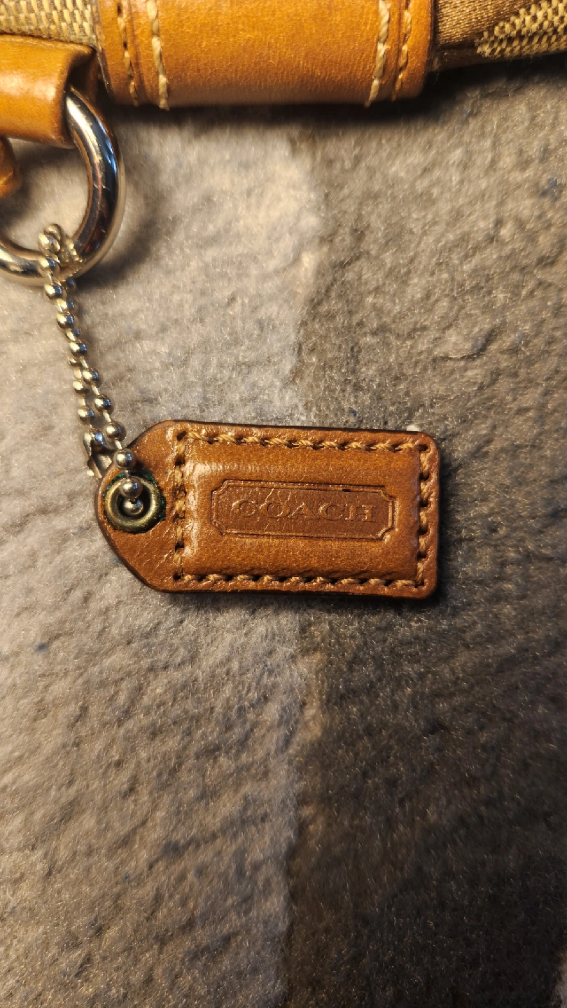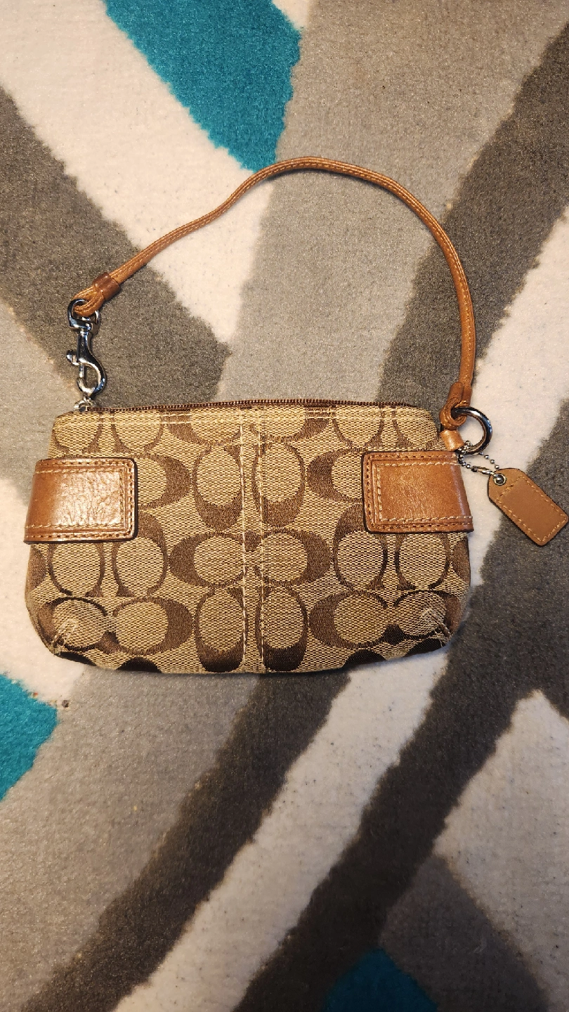 25This is a cute little Coach mini baguette bag with the signature Coach print! It's perfect for carrying just the essentials when you don't want to be weighed down by a larger purse