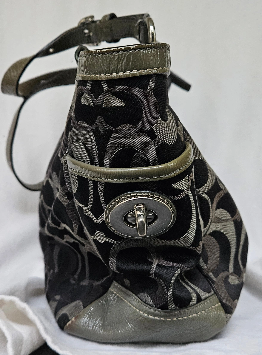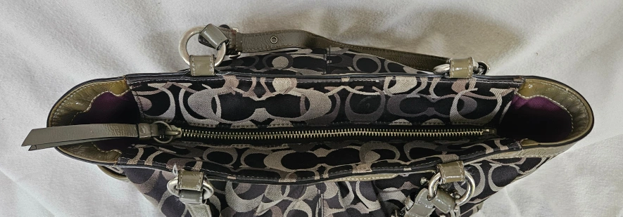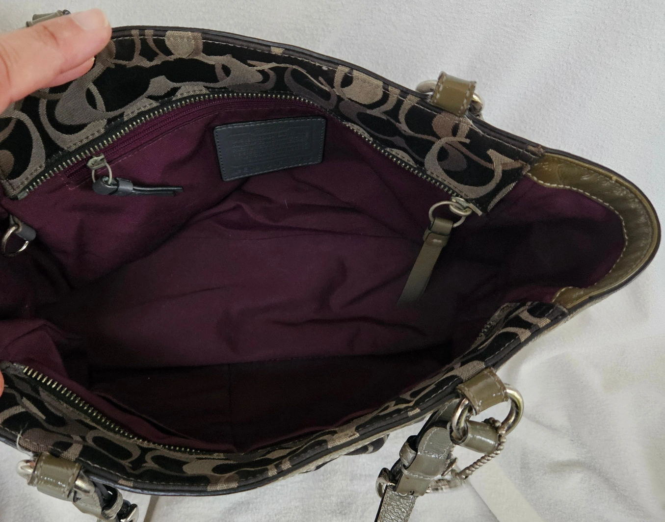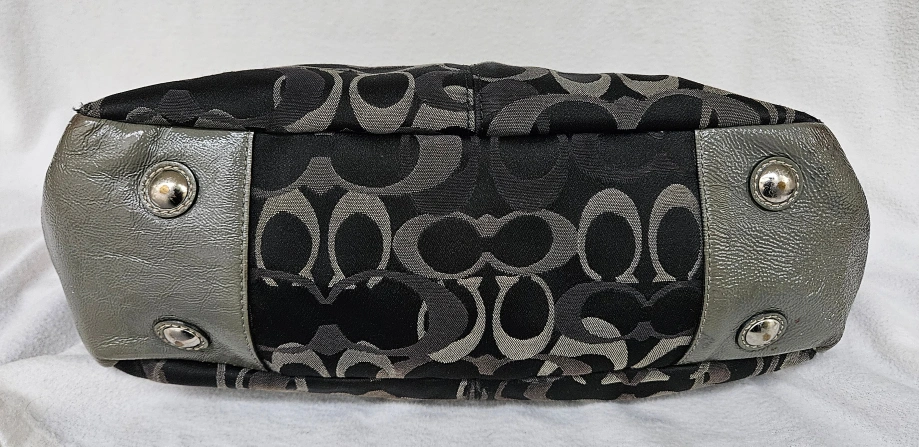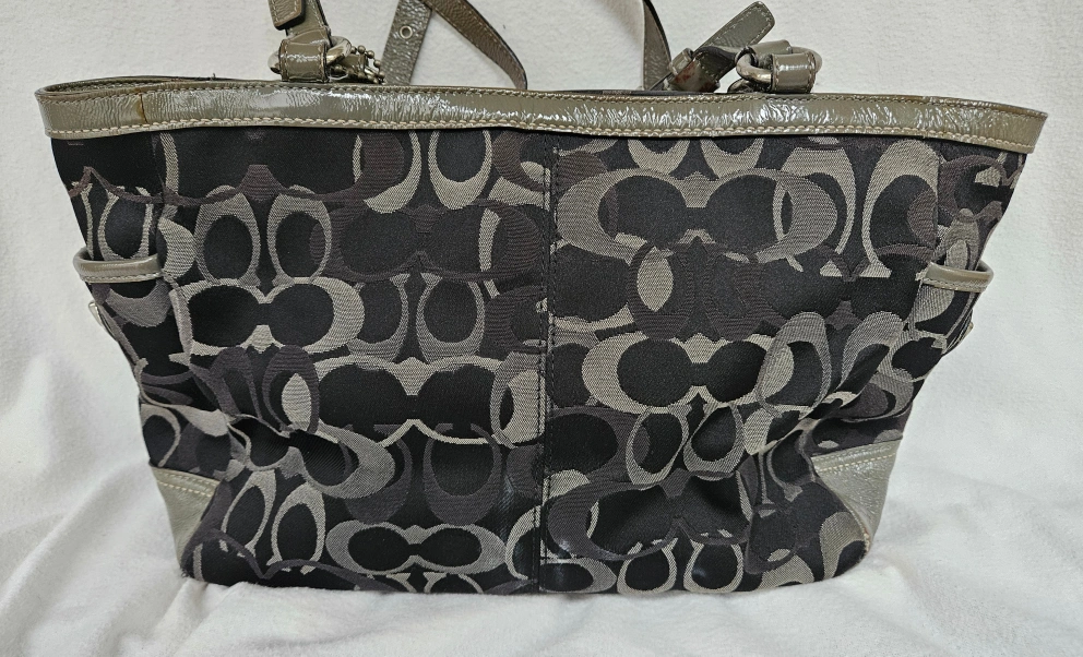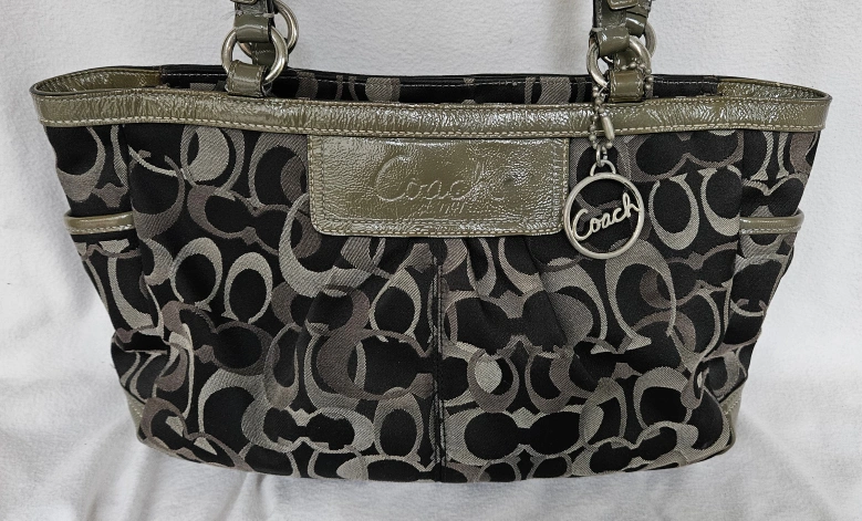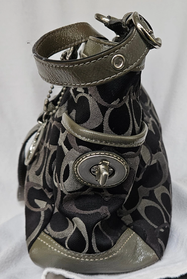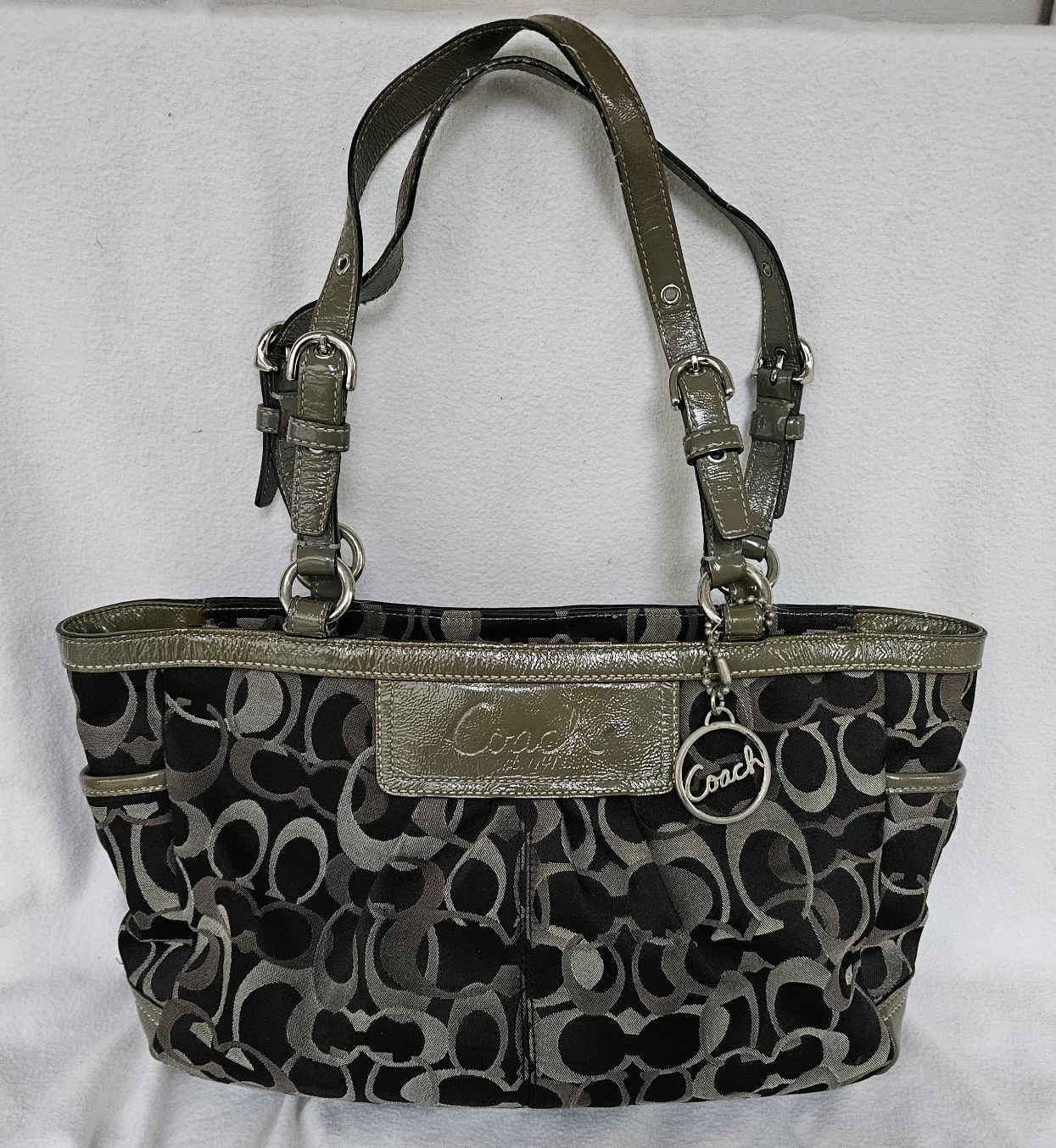 1000+Coach Signature Optic Gallery Tote Bag Black Gray No. E0982-F13762 This Coach Signature Optic Gallery tote bag comes in black/gray is in excellent cond. There are no rips, tears or stains of any kind. This Coach Signature Optic Gallery tote bag features adjustable double straps 2 side pockets with turn-lock Interior has 1 Zipper Pocket & 2 Open Pockets and the measurements are 13.5 x 8.5"x 4.5" (inches)