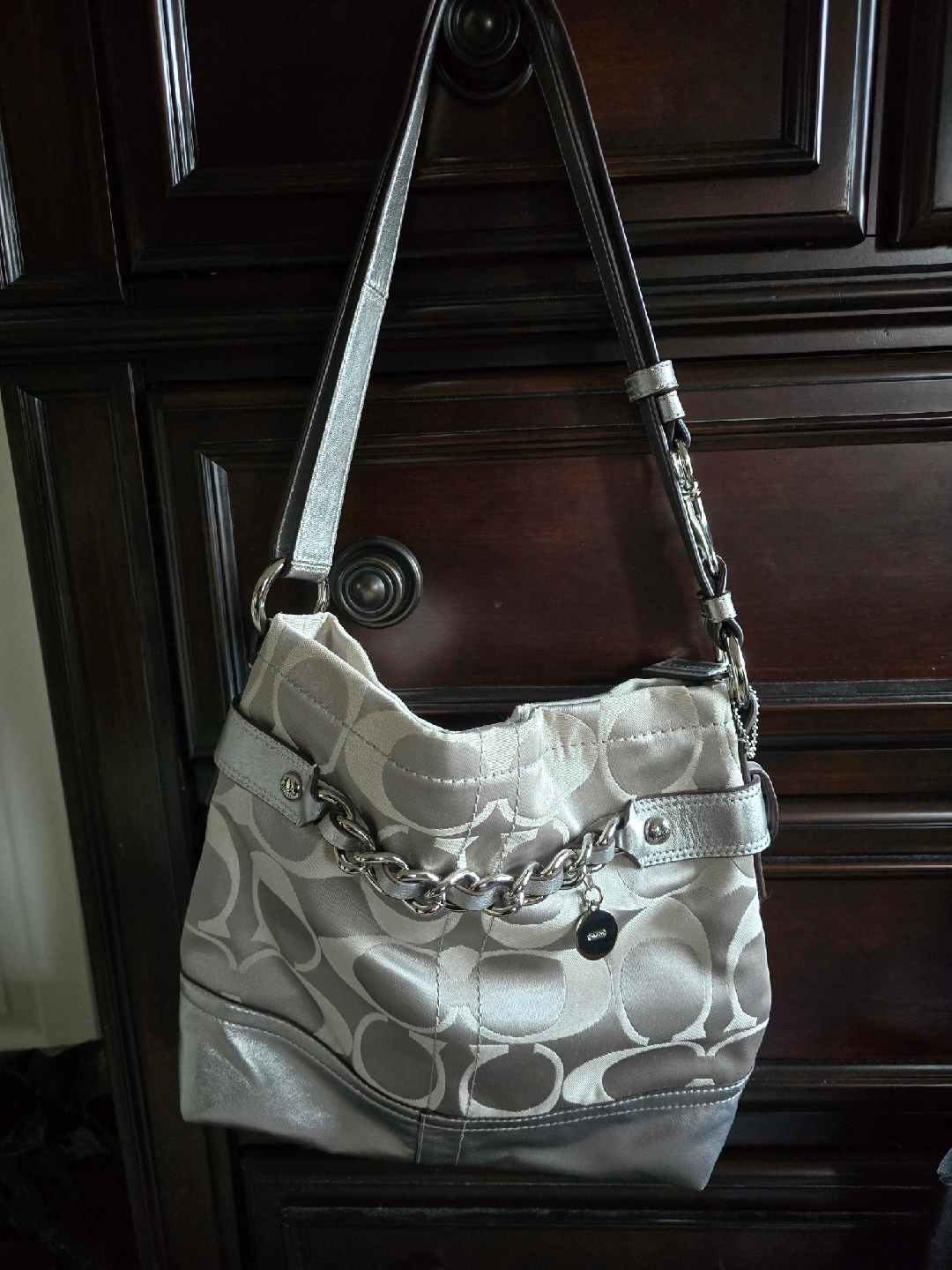 73Selling a Coach shoulder bag in silver. It's in great condition and perfect for everyday use! The bag features a stylish chain detail and a spacious interior.