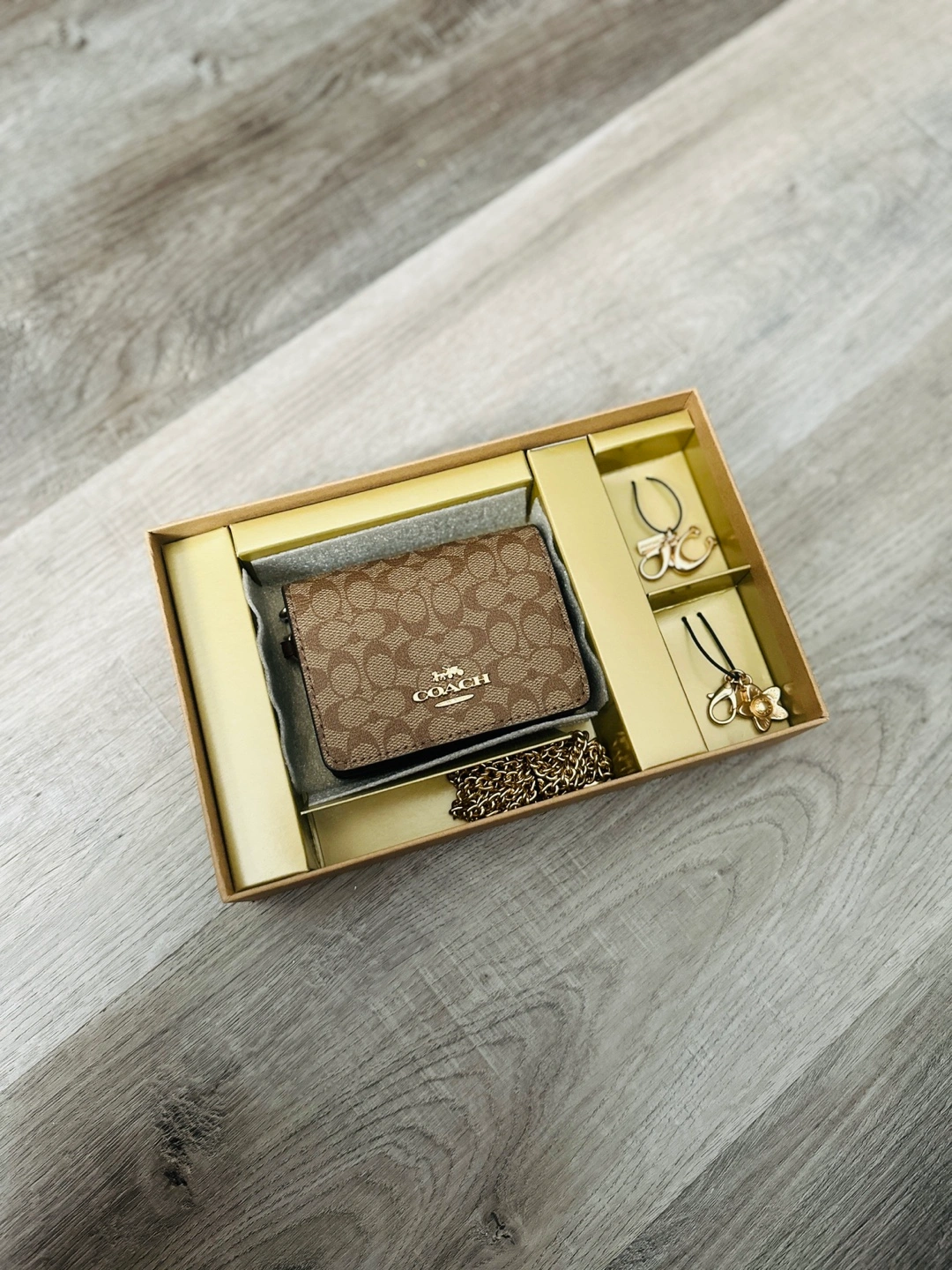 Small brown wallet with chain, comes with a keychain. All in original box.