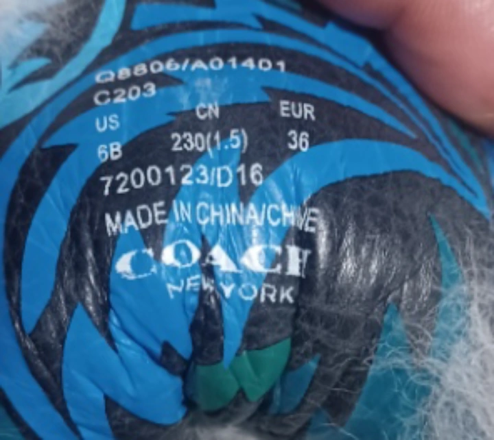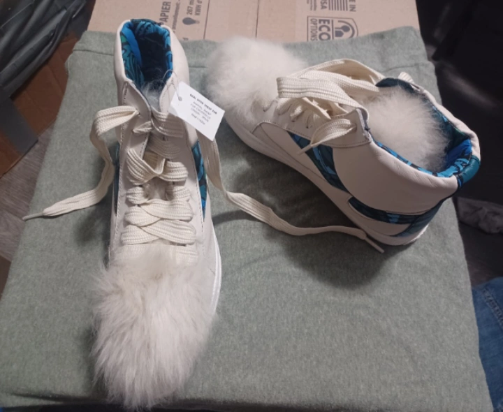152 pairs. Price is per pair. White leather high top sneakers with blue patterned accents. Fur pom pom on top of each shoe.