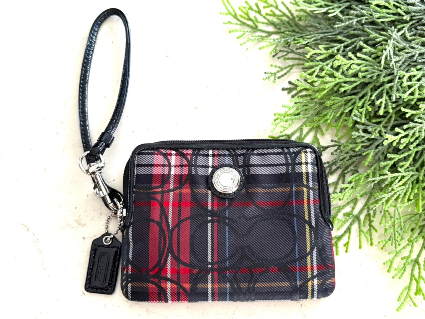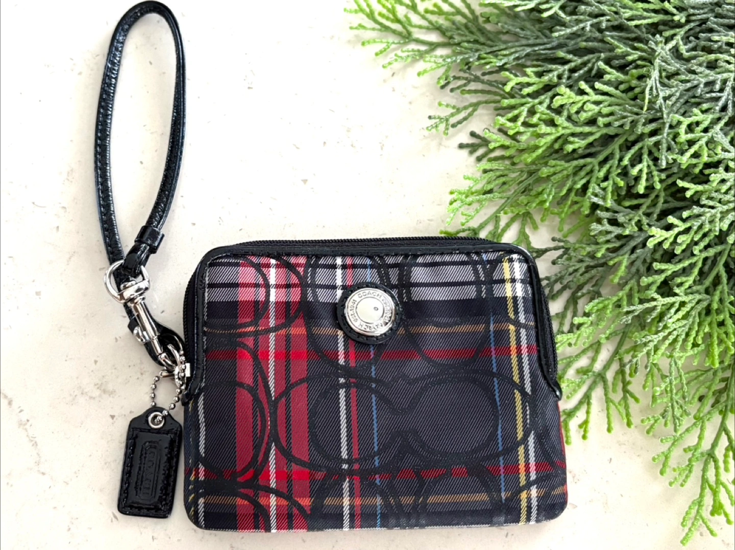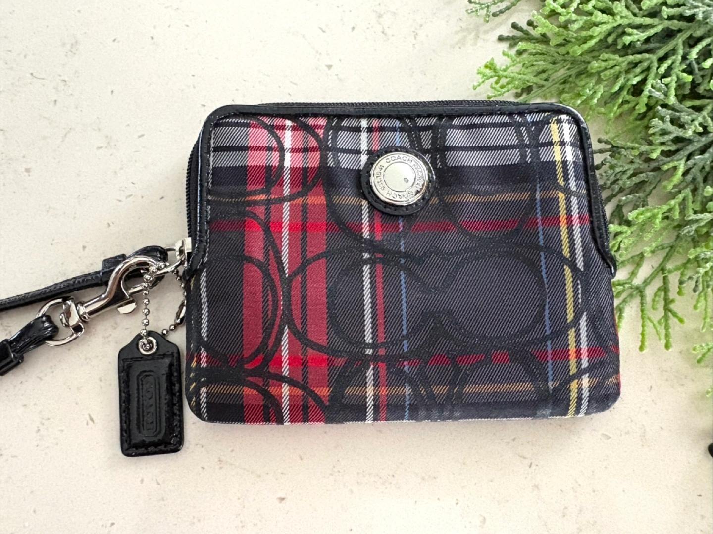 Selling a cute Coach wristlet! It's in new condition and perfect for carrying your essentials. The wristlet has a plaid design with a black wrist strap and interior. The interior is red with a zipper pocket and card slots.