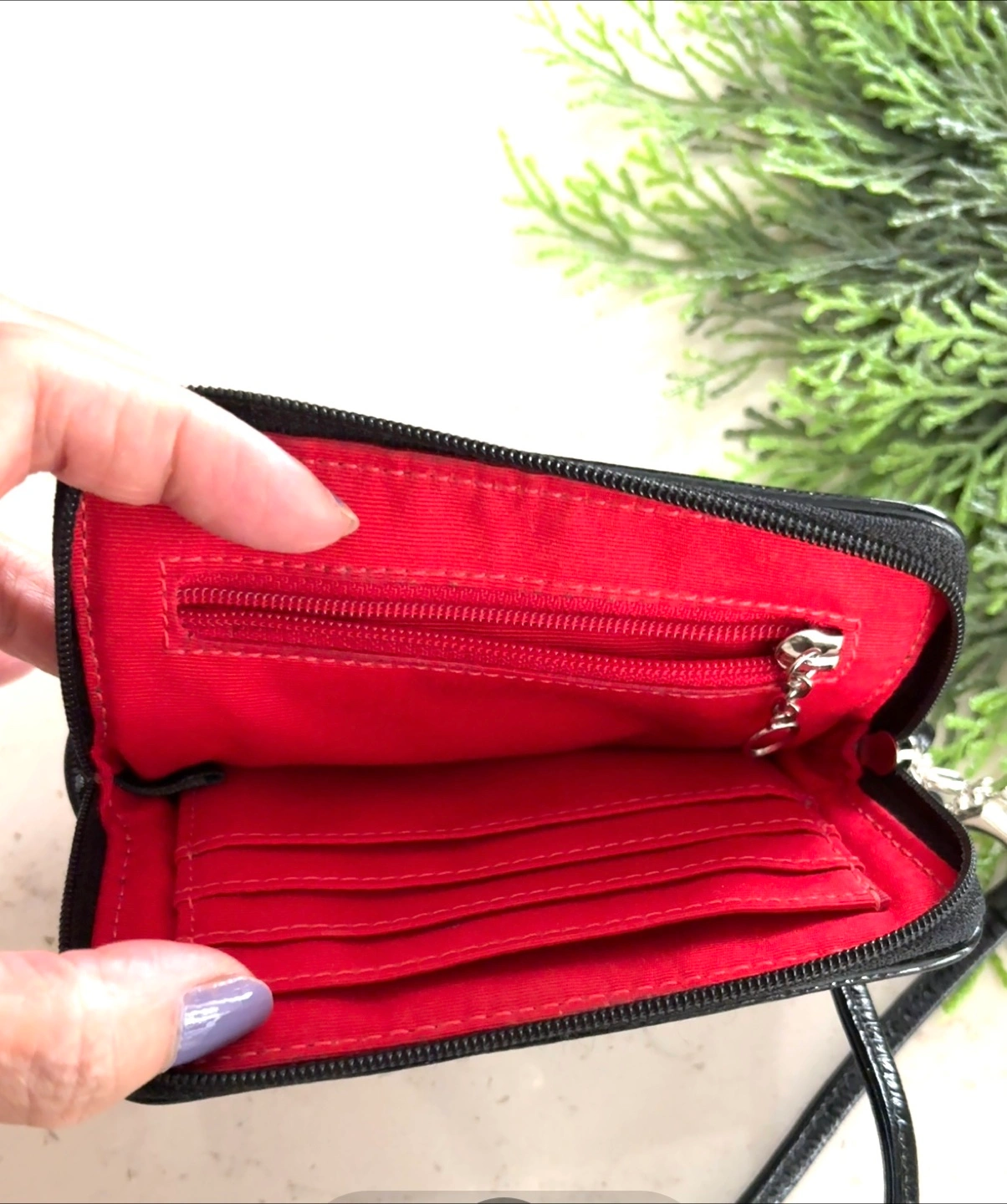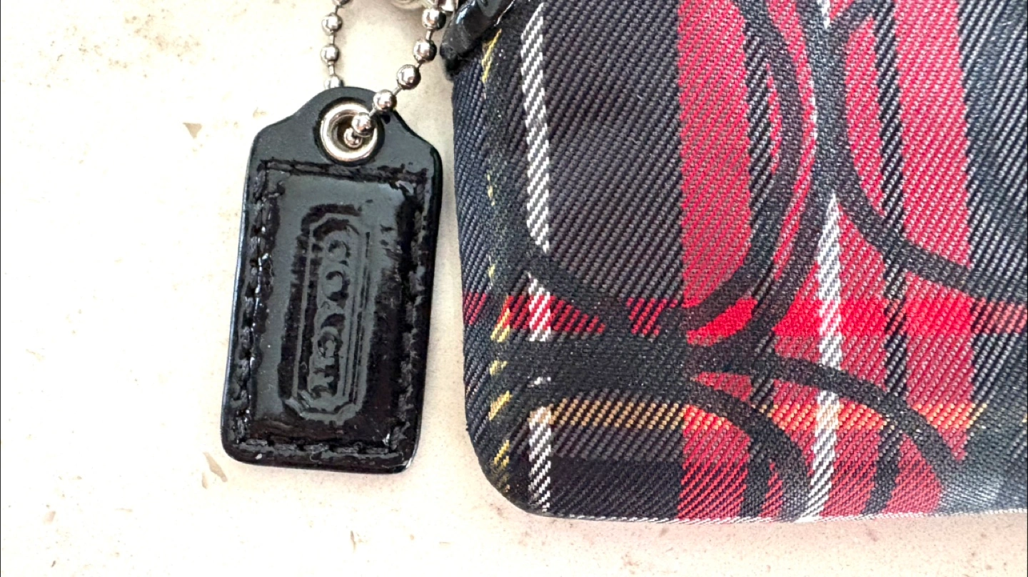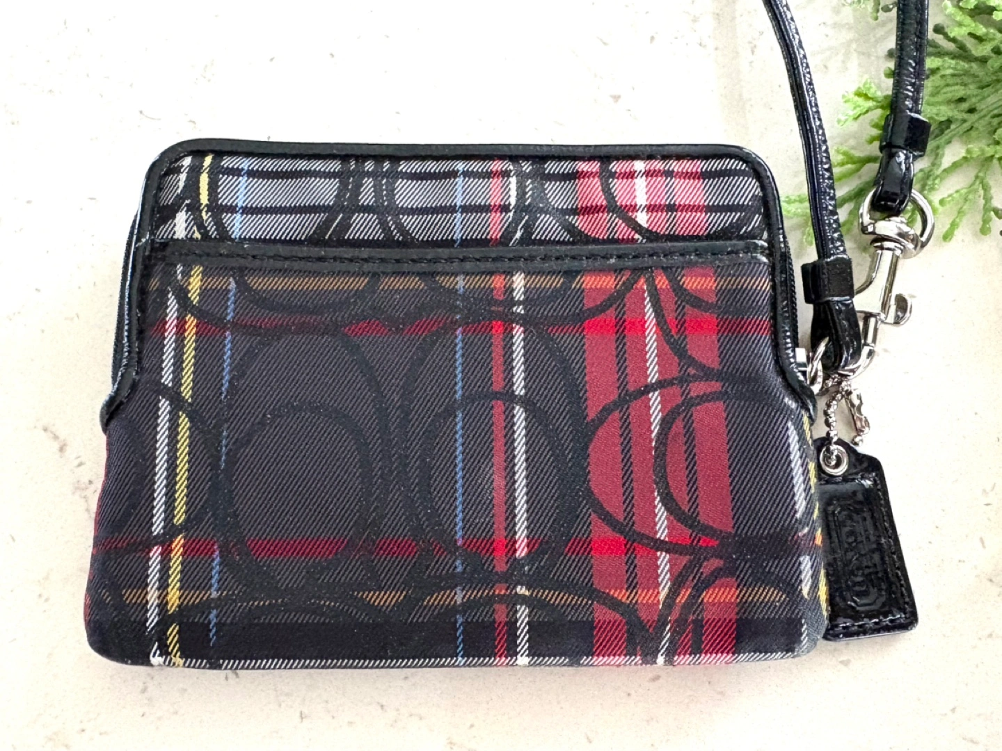 Selling a cute Coach wristlet! It's in new condition and perfect for carrying your essentials. The wristlet has a plaid design with a black wrist strap and interior. The interior is red with a zipper pocket and card slots.