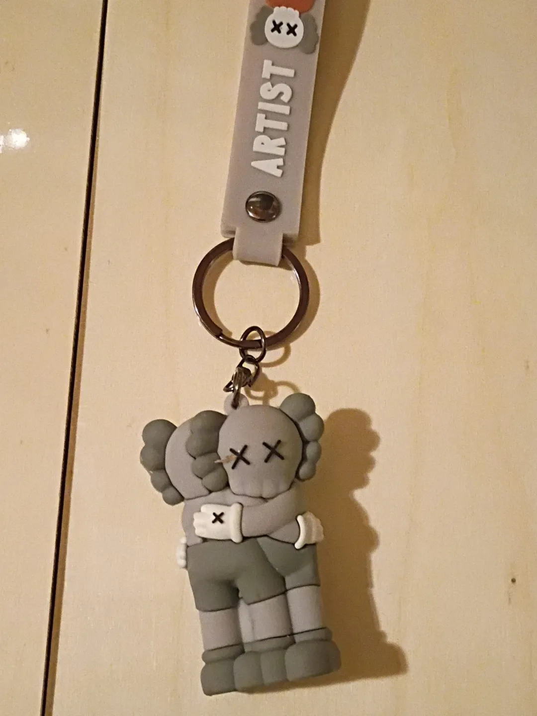 This gray keychain features two KAWS Companion figures in a hugging pose. The strap has 'ARTIST' printed on it. It's a fun accessory for bags or keys!