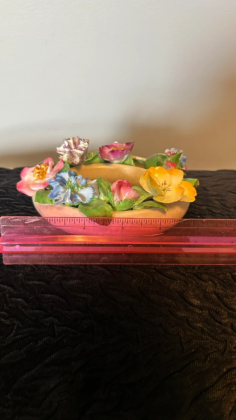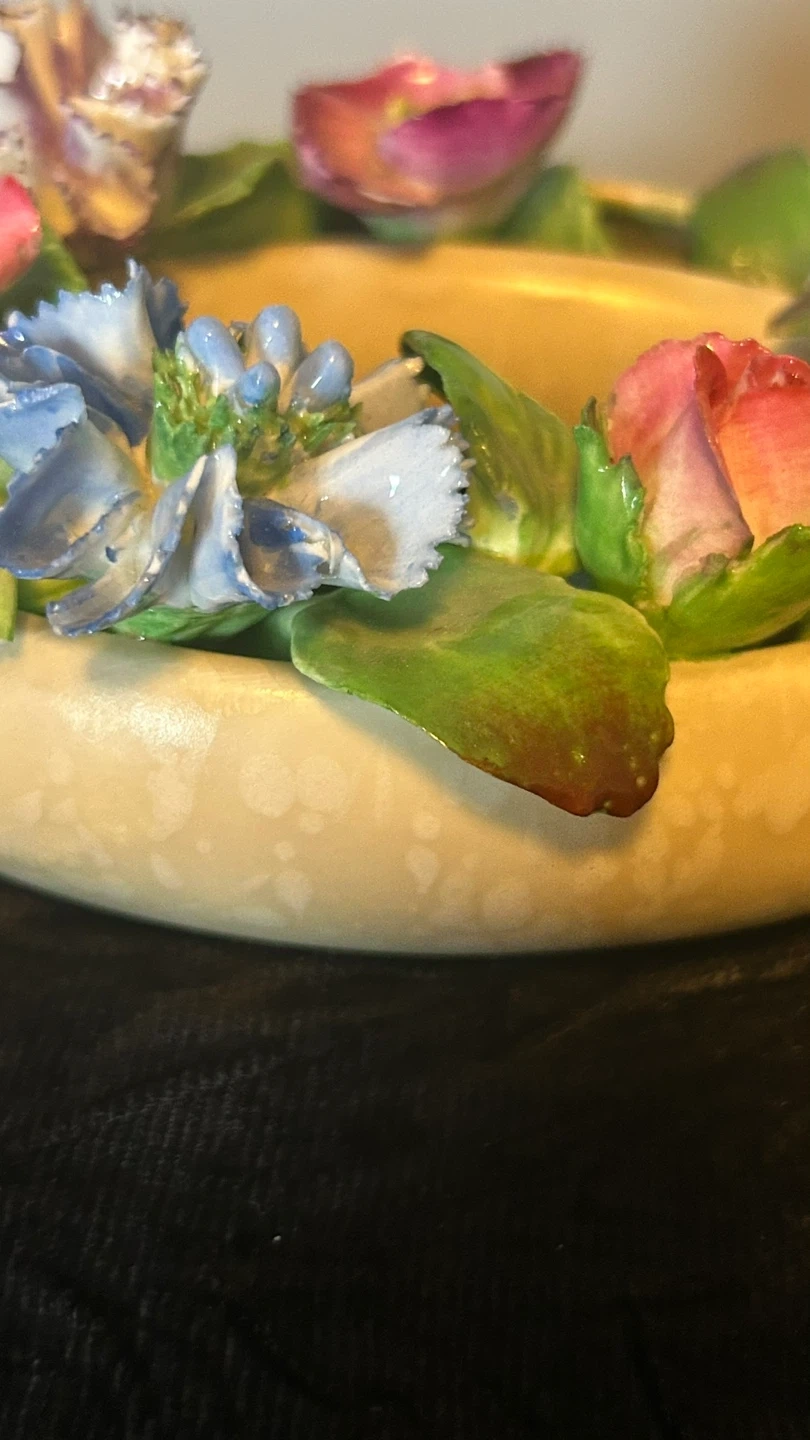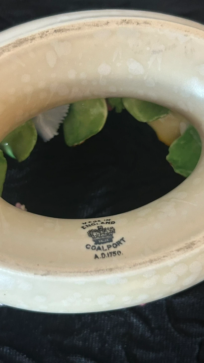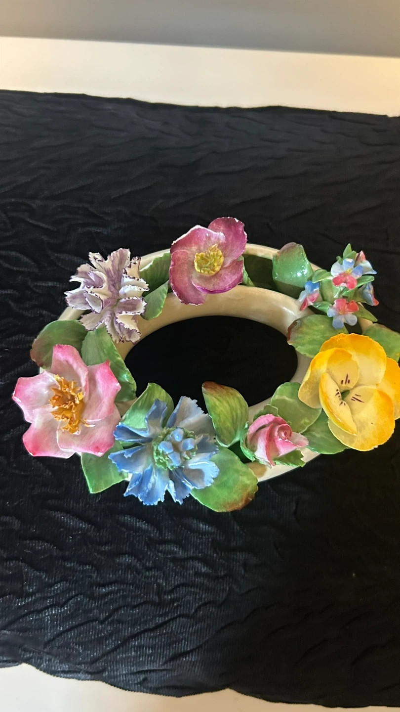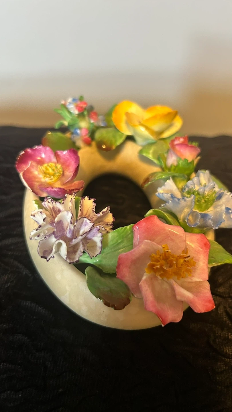 Mid-Century Porcelain Coalport Floral Ring. Matte glaze on ring. Stamped Made in England, Coalport AD 1750. Gorgeous Hand Painted English Floral Bouquet. Small chips on 2 flowers & leaves but considering the age they are not prominent.