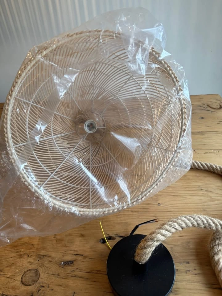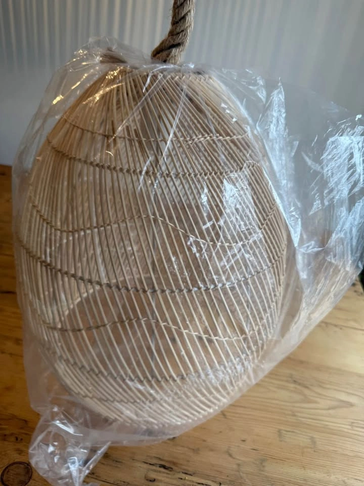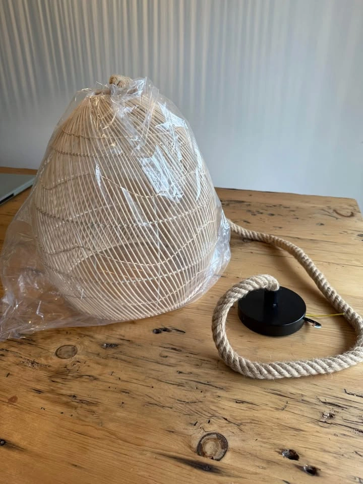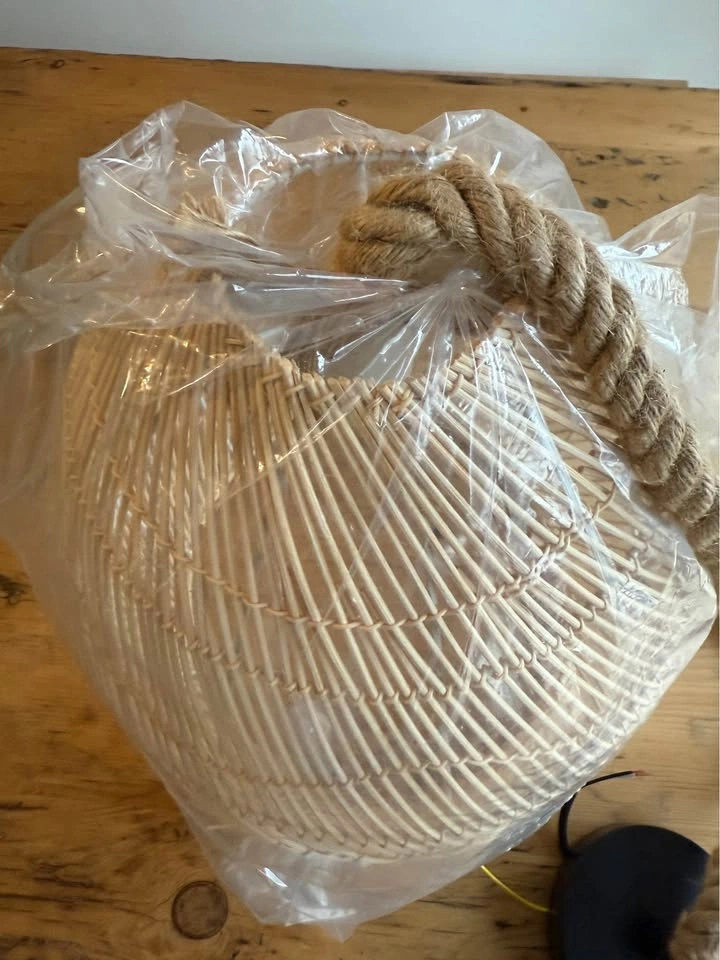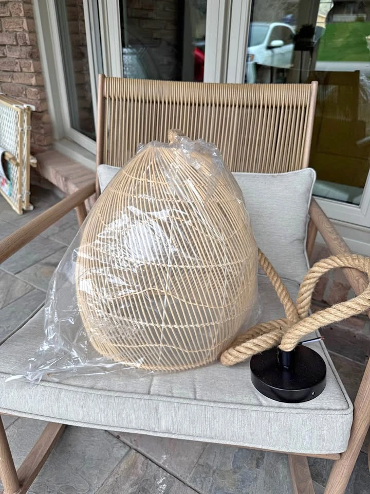 10Add a touch of natural charm to any space with this brand-new rattan pendant light! The woven design brings in warmth and texture, perfect for boho, coastal, or farmhouse-inspired interiors. 15 inches high / 12 inches wide Details: • Handcrafted rattan shade in a teardrop shape • Twisted rope cord for rustic flair • Matte black ceiling mount included • Ready to be wired and installed • Never used – still in original packaging! Looks stunning over a kitchen island, entryway, or reading nook. Easy to match with neutral decor and wood tones. Pickup in Flamborough near Dundas golf course.