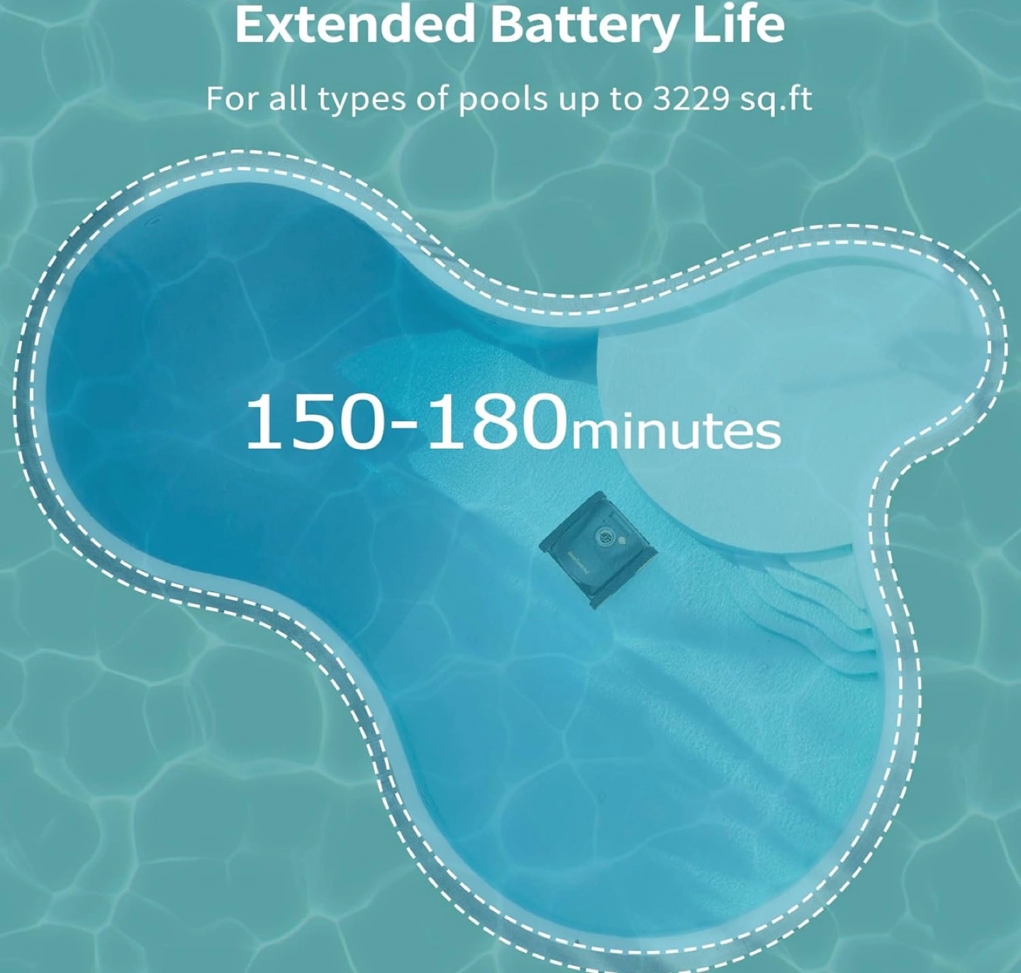 Automatic pool cleaner, smart path planning, strong suction power. Designed to break up dirt and grime, 2 rolling brushes, 3 side brushes, 5550 gal/hr flow rate, 150-180 minute run time, cleans pools up to 3229 sq ft.