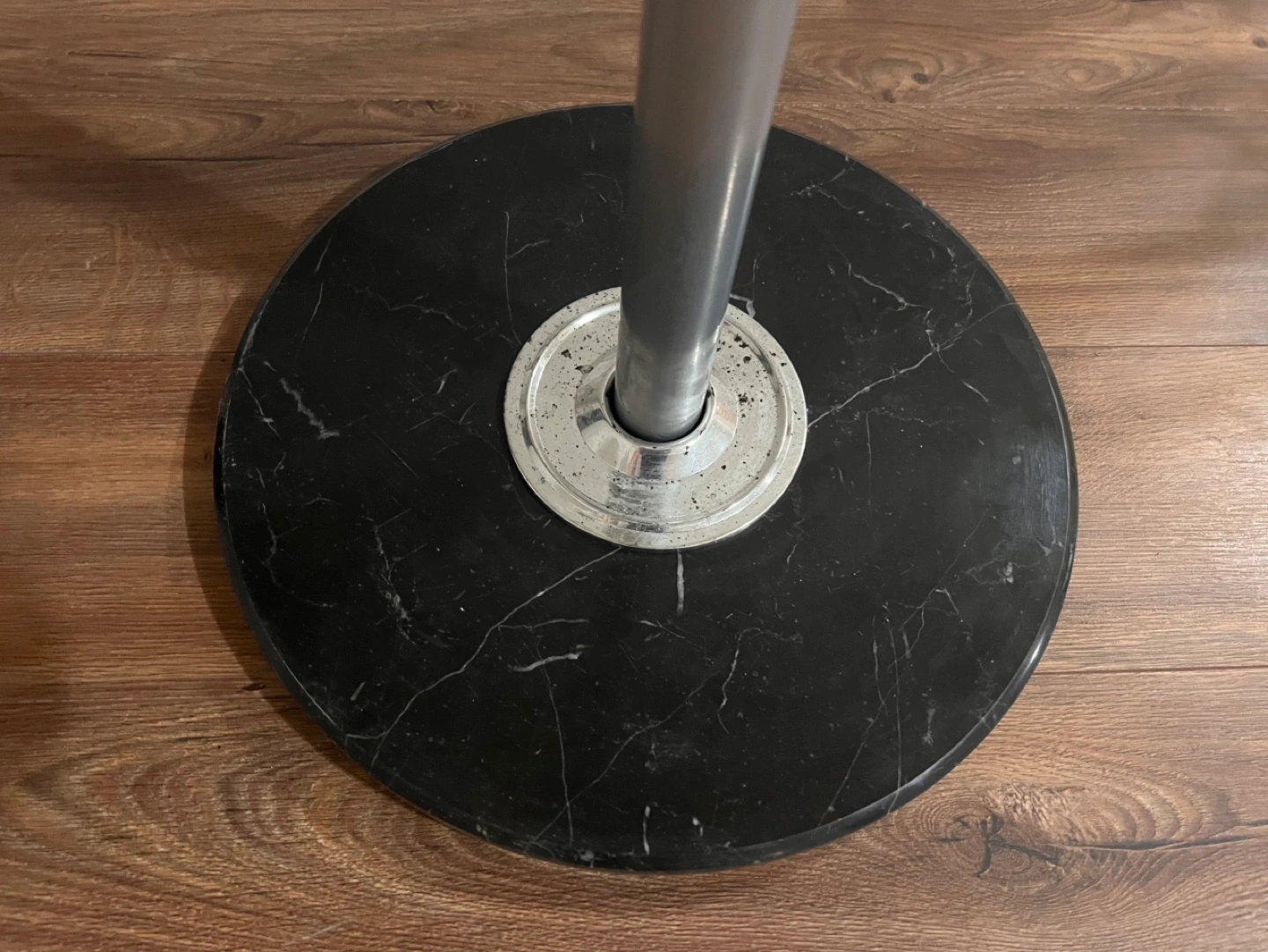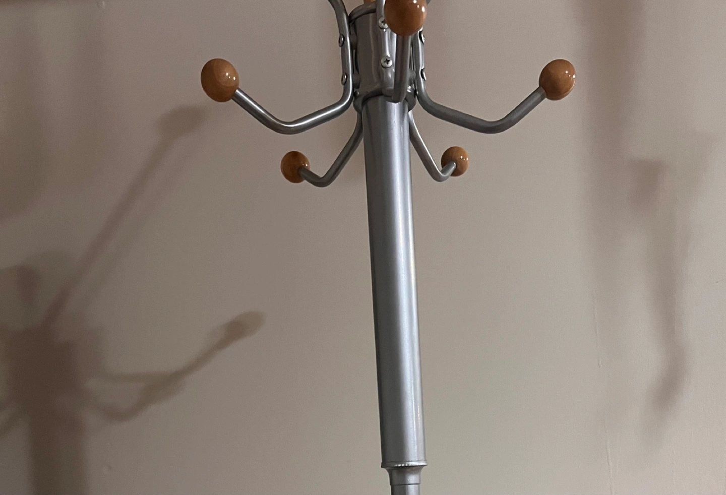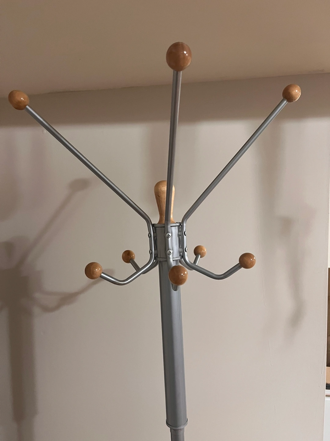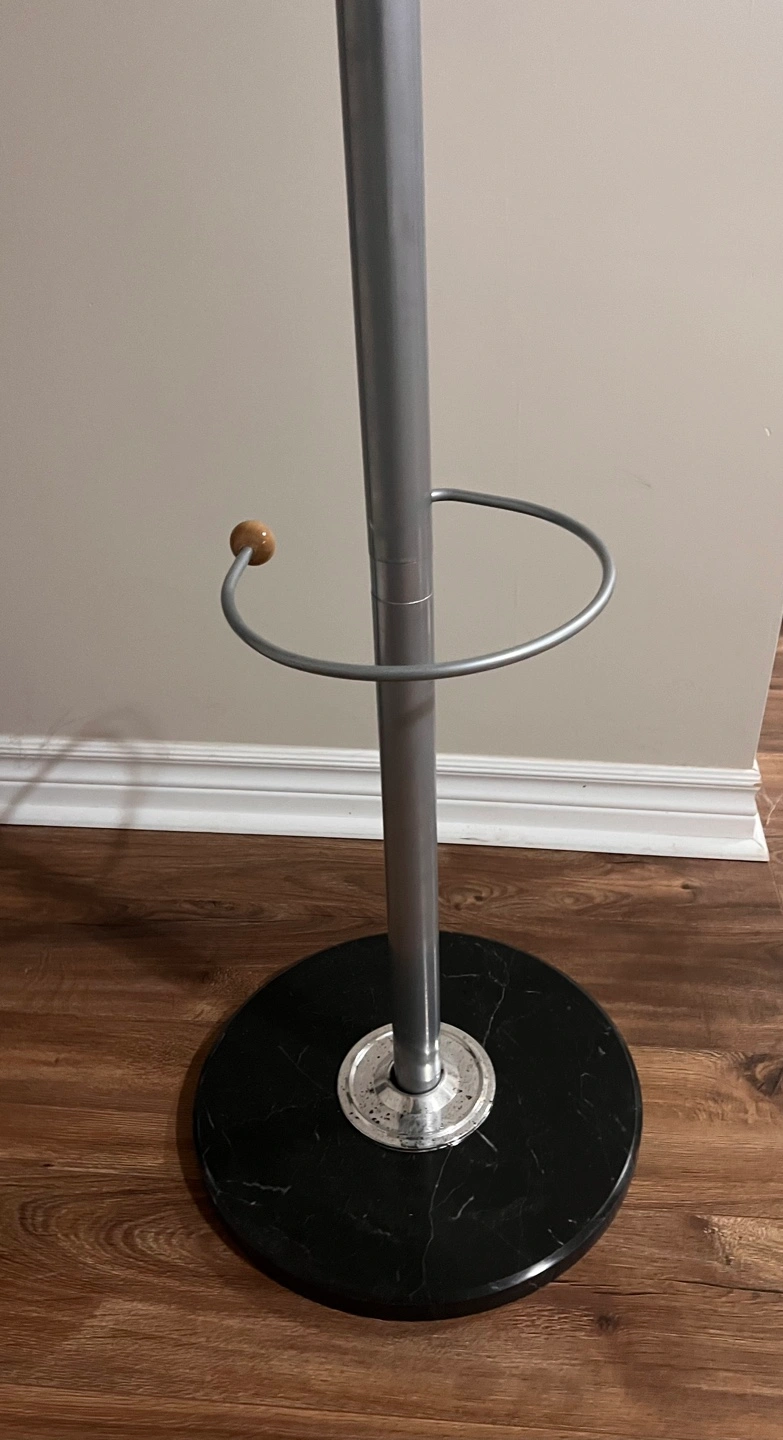 180Coat rack with a marble base and multiple coat hooks. Good for hanging jackets. Silver and Crème coat rack with wooden knobs and a ring for hanging items. Has a design on the black marble base. The marble base makes it very sturdy and strong. The marble is in very good condition. The top hooks is missing one hook (3 of 4). The rod is of steel finish and is also in good condition. The stand comes off in parts for easy carry. The stand is about 72” tall from the base. Similar coat rack retails at $55-$70 plus tax. Priced to sell. Price is firm. Pickup is near Bramalea City Centre. It’s available. Just message the day and time of pickup
