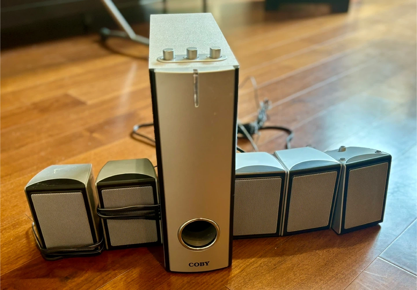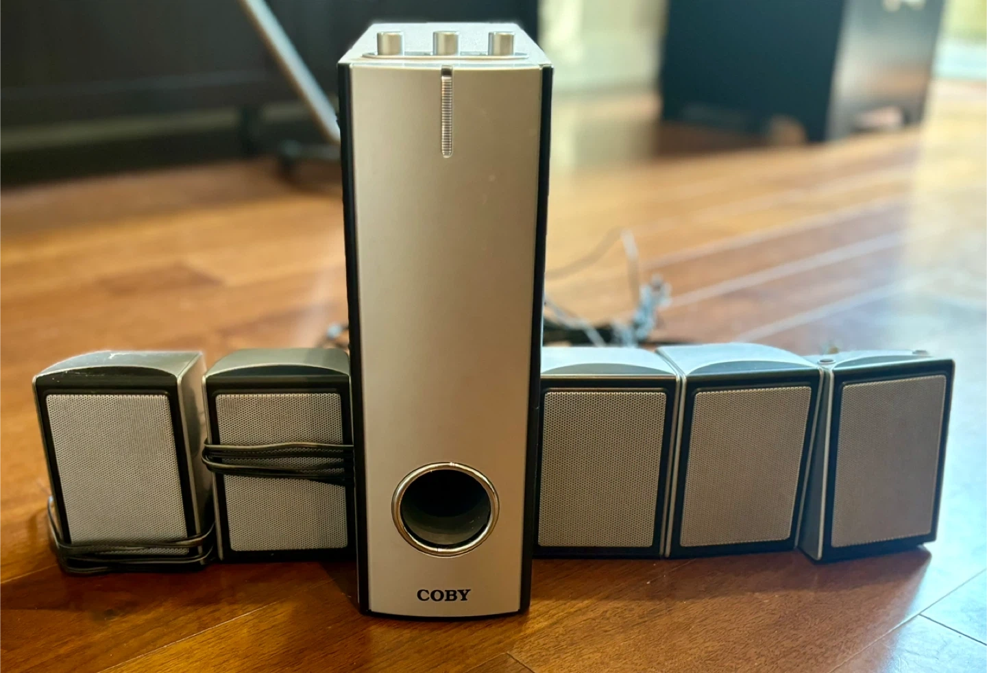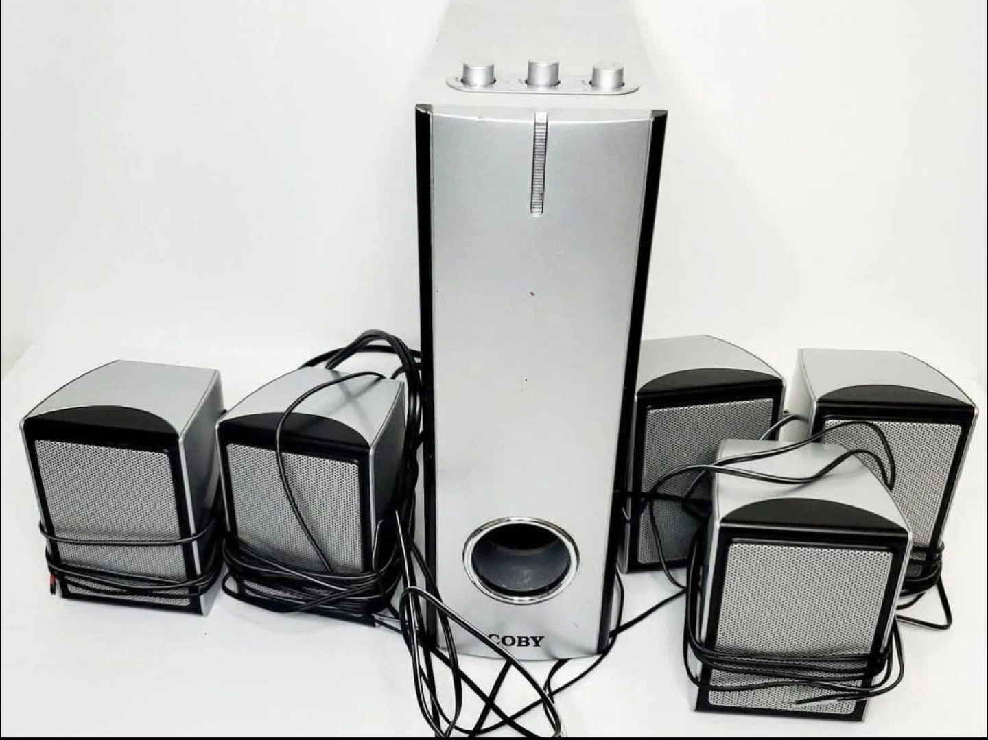 Selling a Coby 5.1 channel home theatre speaker system. It includes a subwoofer and five satellite speakers. Perfect for enhancing your home entertainment experience!