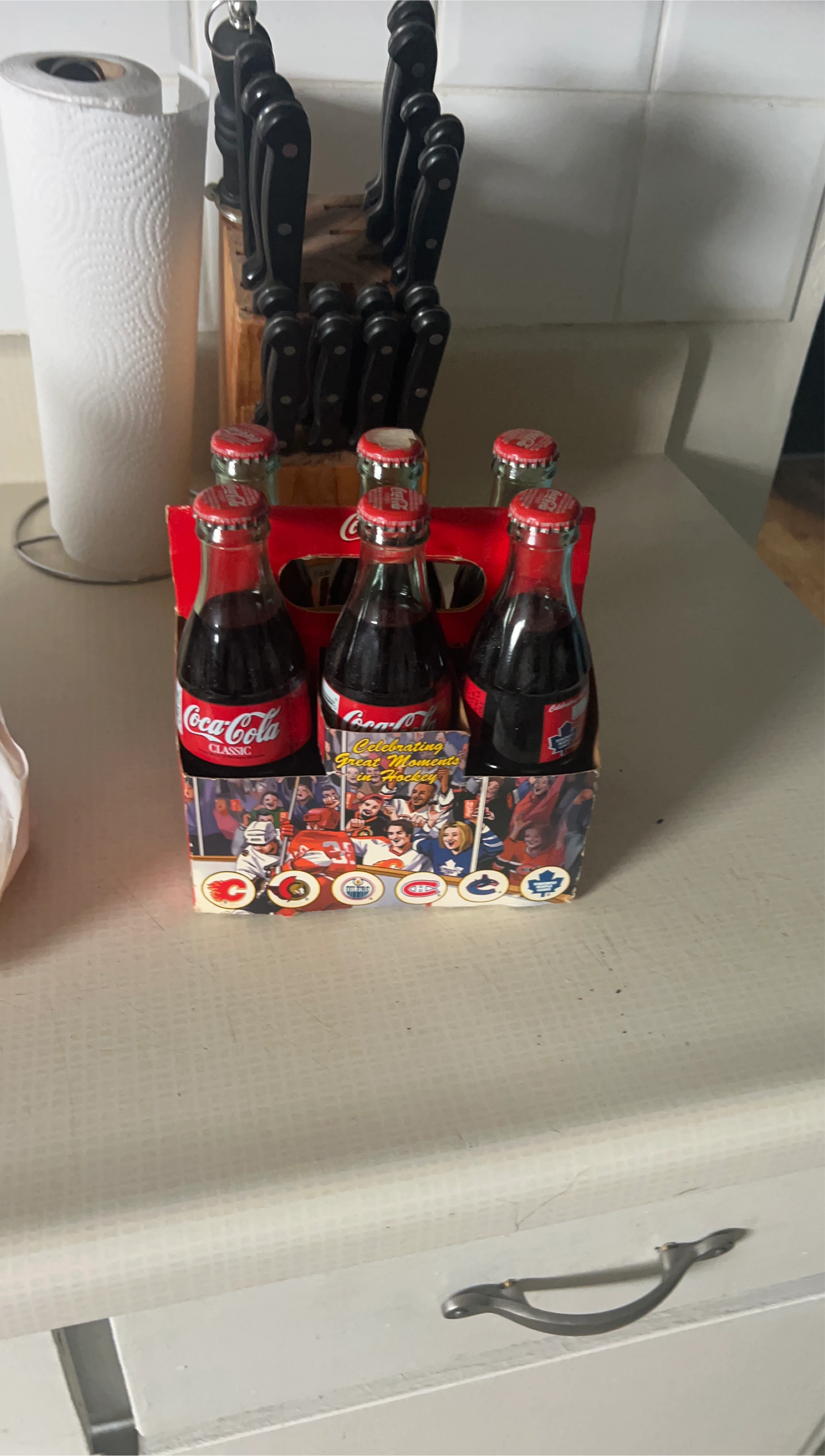 10Selling a pack of Coca-Cola bottles celebrating great moments in hockey! These are classic Coca-Cola bottles with a special edition design featuring different NHL teams. Perfect for any hockey fan or Coca-Cola collector!