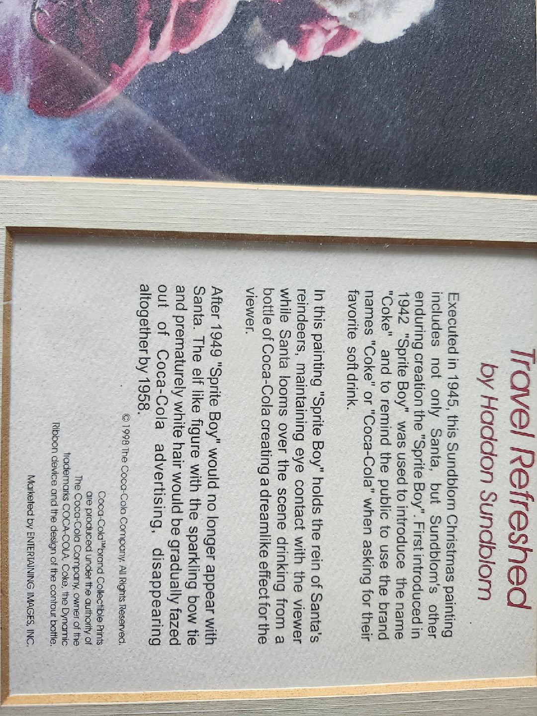 338Selling a framed Coca-Cola brand collectible print titled "Travel Refreshed" by Haddon Sundblom. This print is a limited edition, with only 100,000 prints made. It features Santa and the Sprite Boy character in a vintage Coca-Cola advertising scene. A certificate of authenticity is included, making it a great piece for any Coca-Cola collector!