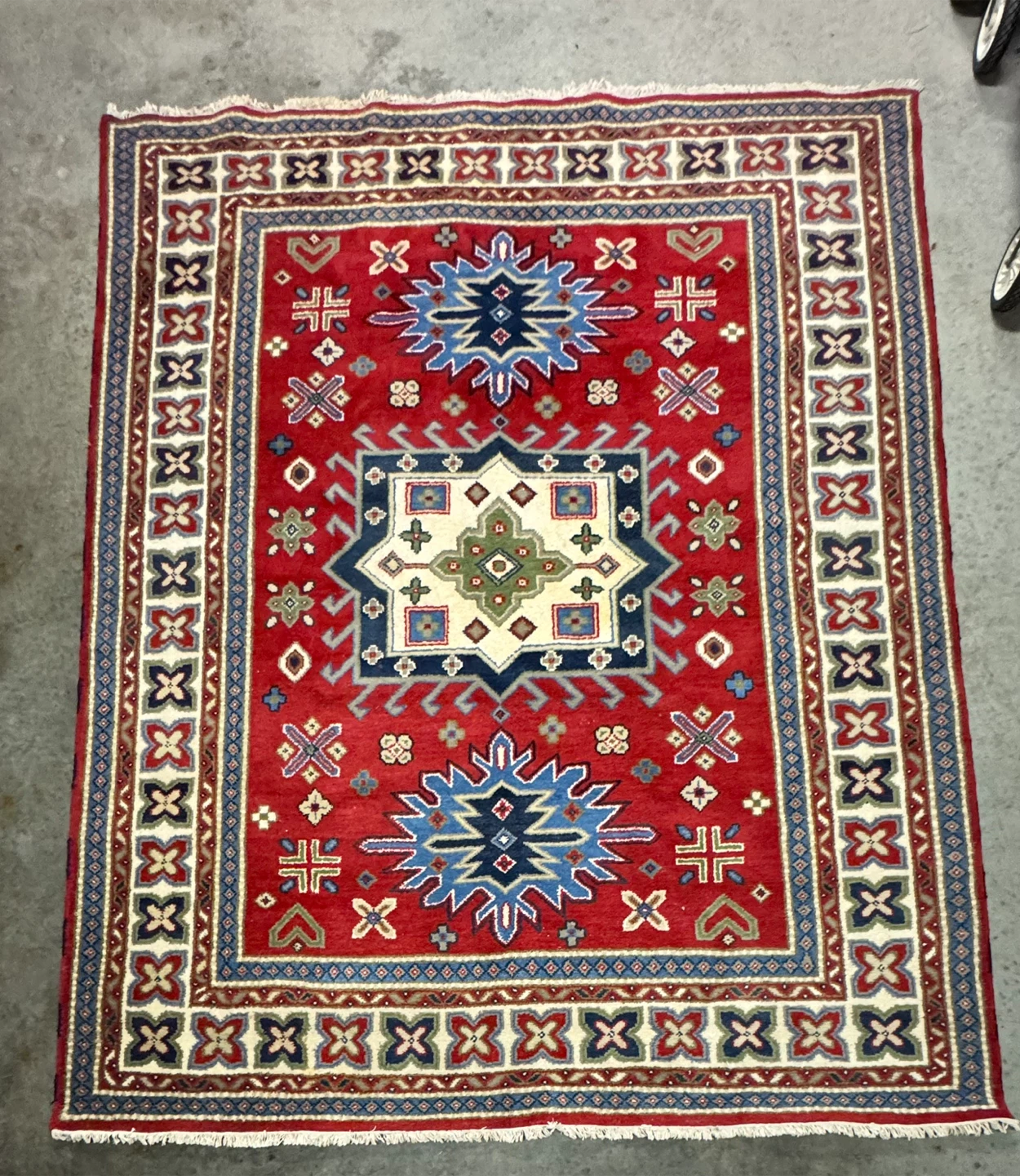 A vibrant red area rug with a beautiful geometric pattern! It would look great in a living room or bedroom. It's in good condition and ready for a new home