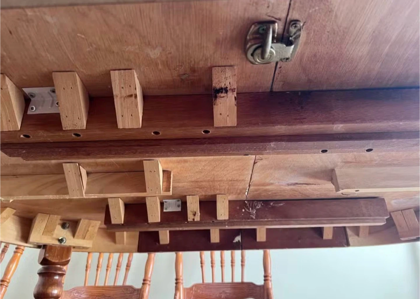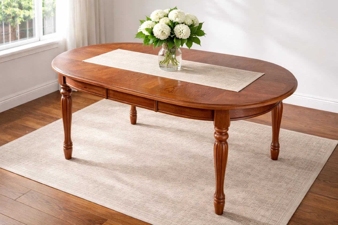 Solid wood oval dining table with four legs. Beautiful wood grain detailing on the tabletop. This table's classic design fits well in most dining rooms. Wood construction.