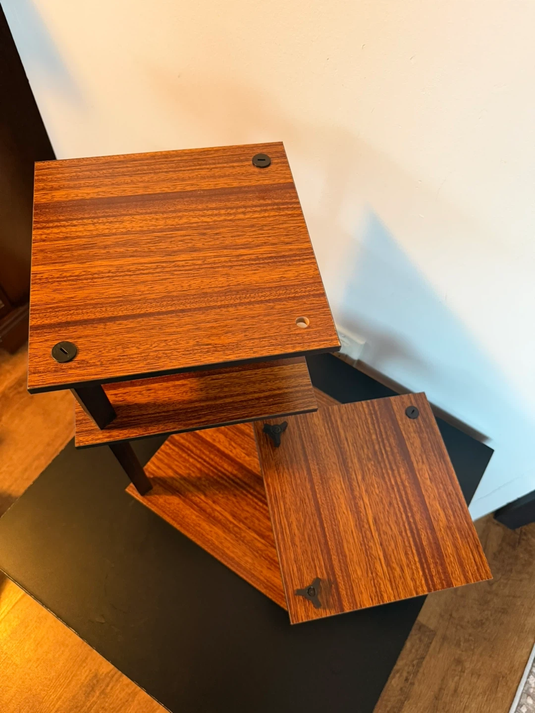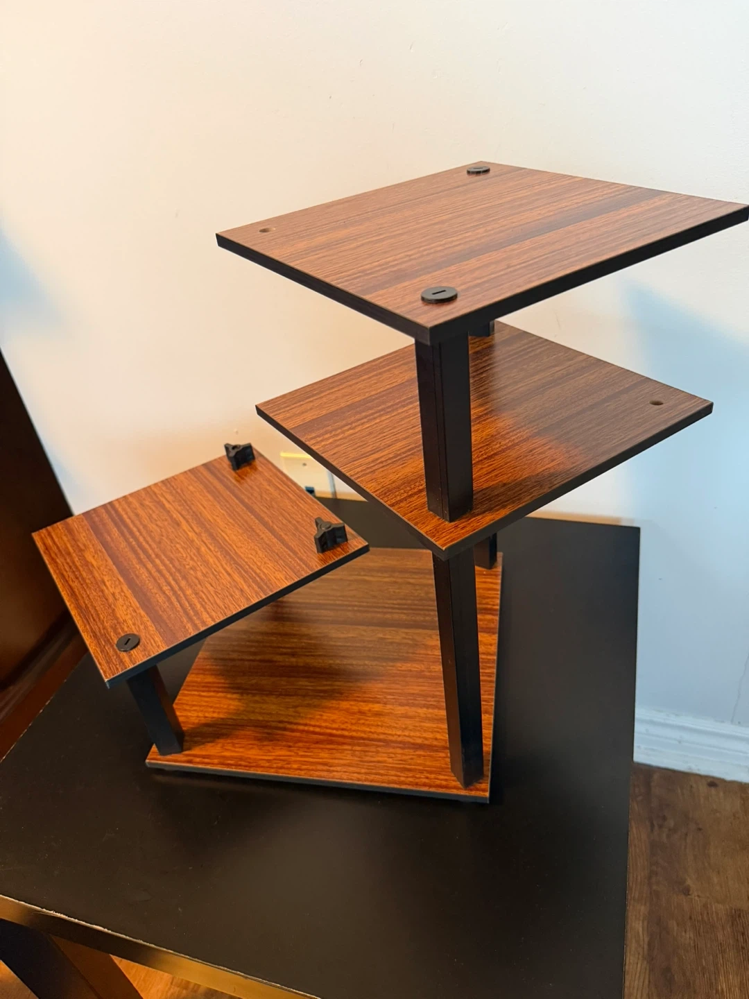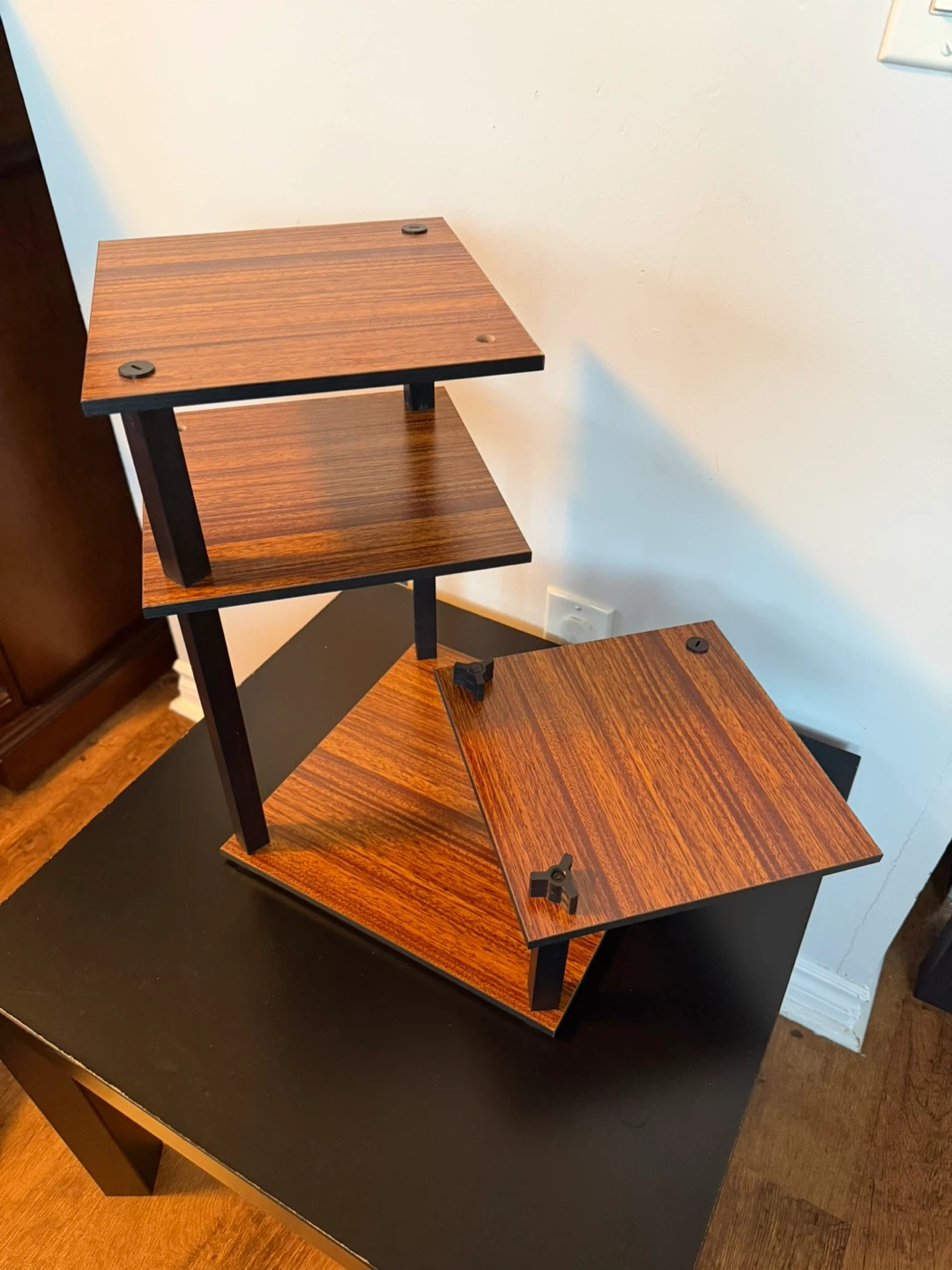 A multi-level wooden shelf unit. It's perfect for displaying small plants, decorative items, or collectibles. The tiered design saves space while offering multiple display surfaces. New never used.