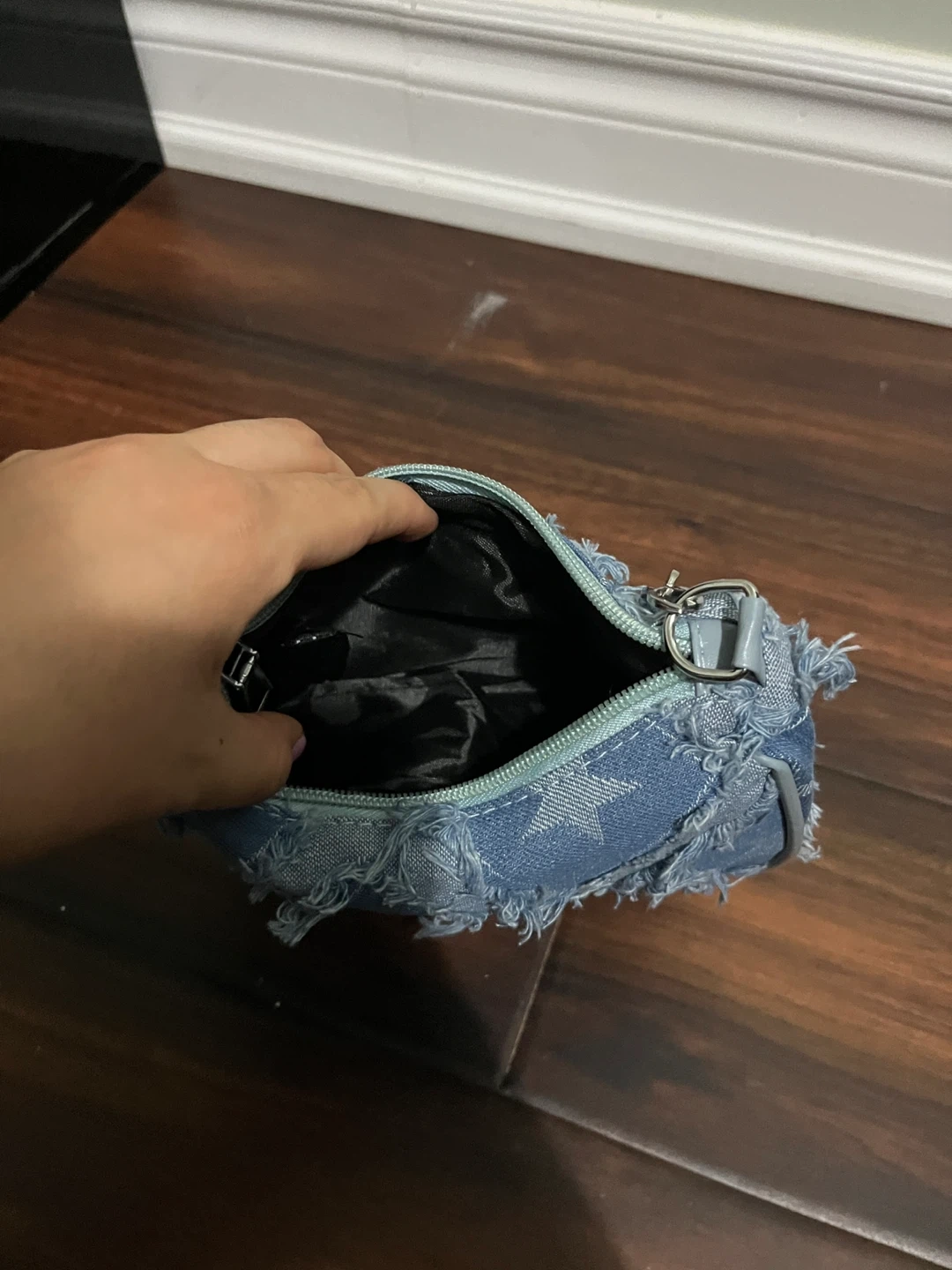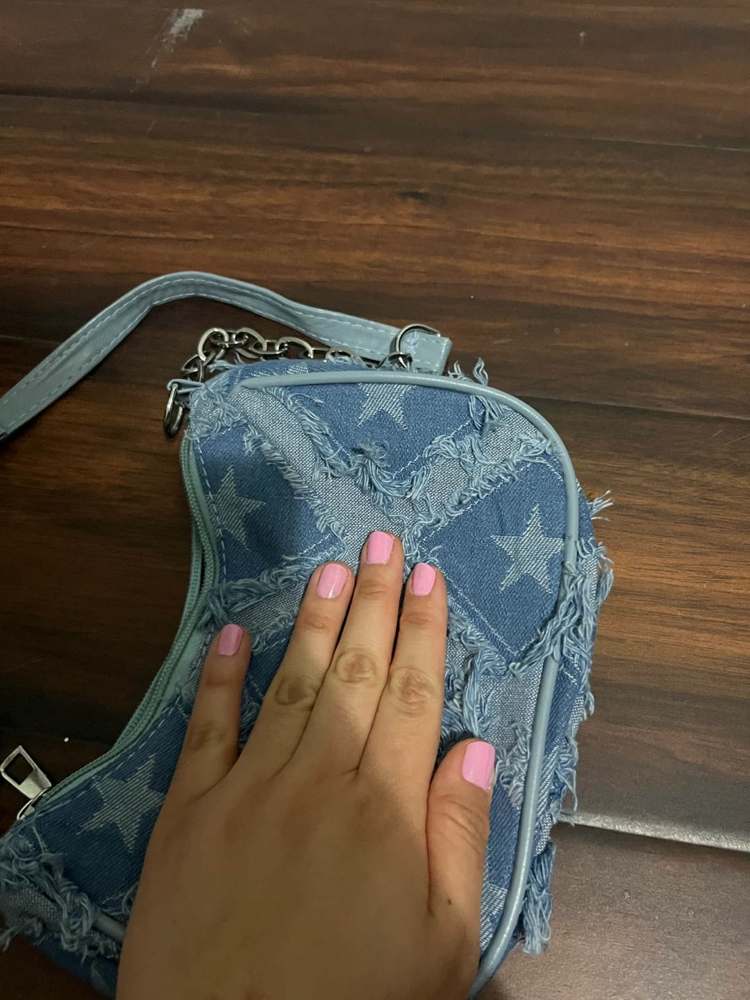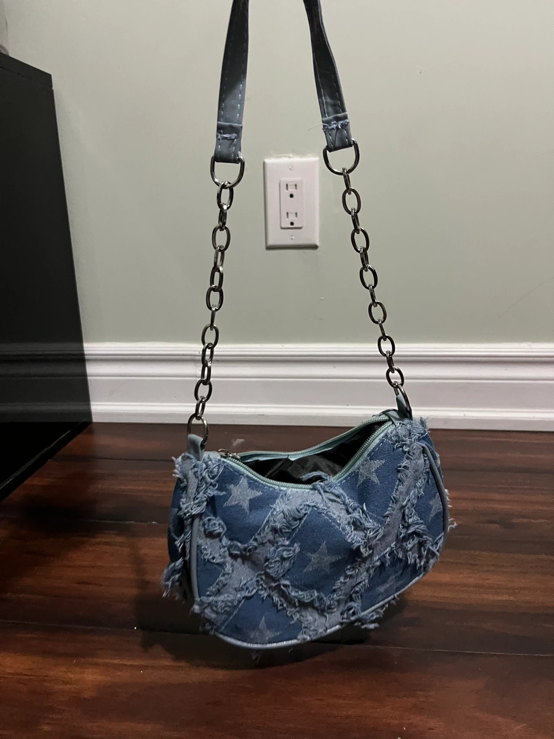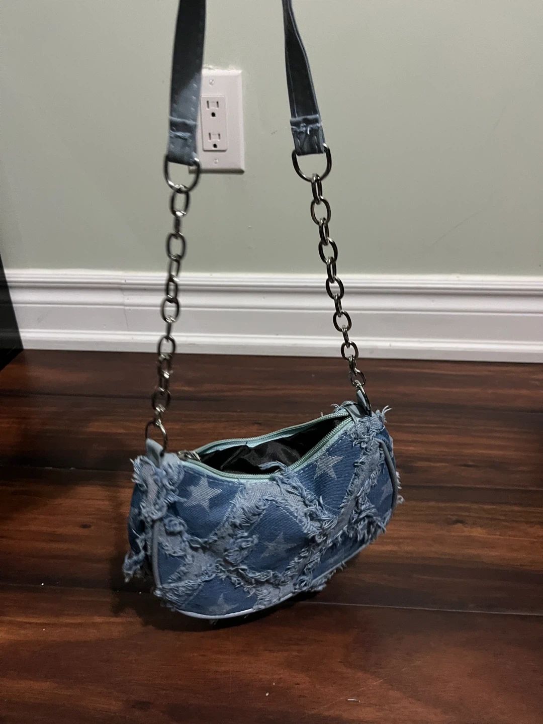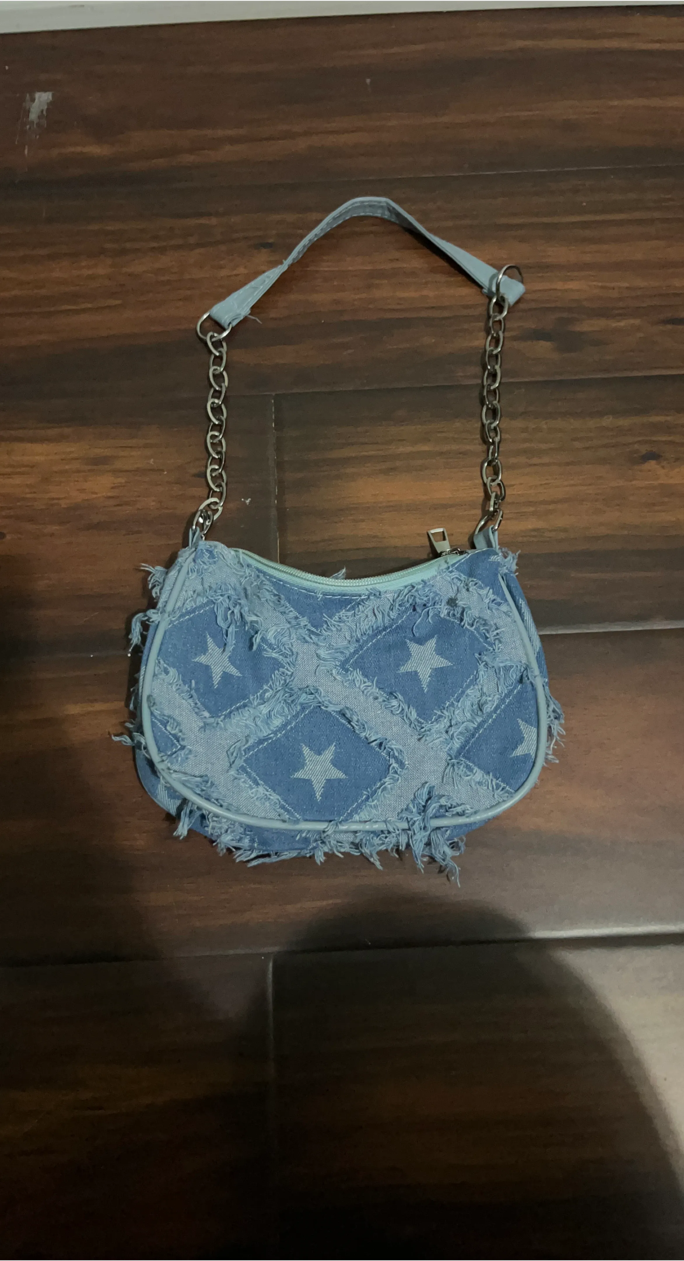 Light wash denim shoulder bag with a distressed star pattern. It features a zippered closure and a chain strap. This bag is a stylish accessory for everyday use.