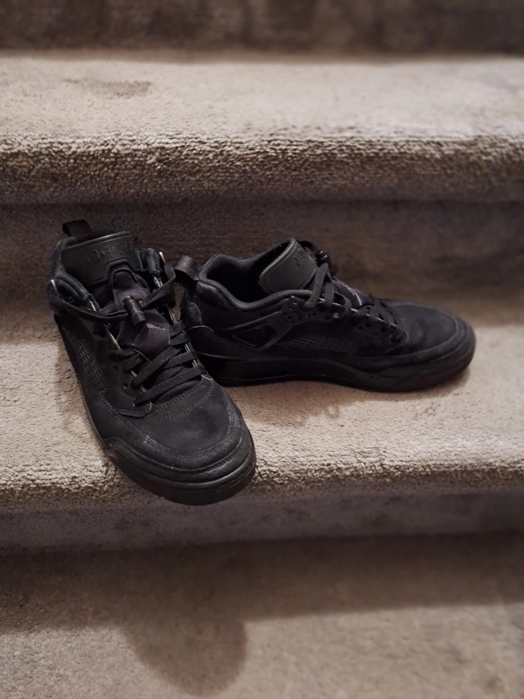 These are black Nike sneakers. They are made of suede and mesh materials. Lace-up closure for a secure fit.