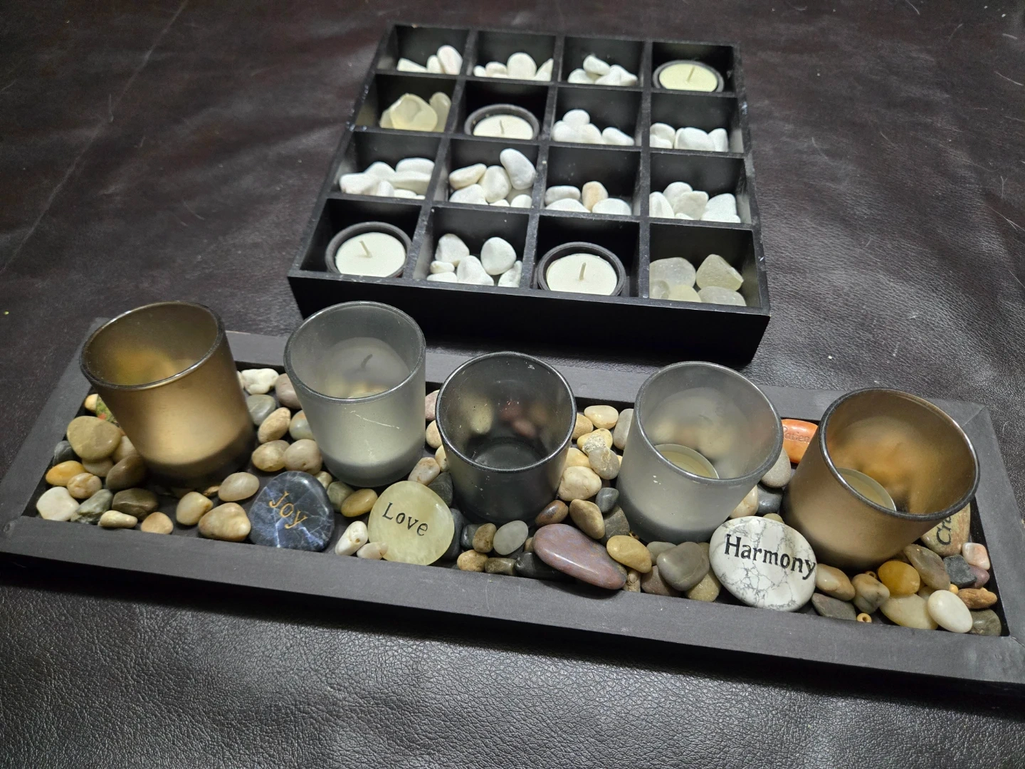 This set includes five glass votive holders filled with assorted decorative stones. Three of the stones are inscribed with "Joy", "Love", and "Harmony". It also comes with a second black wooden tray containing more white stones and eight tea lights.