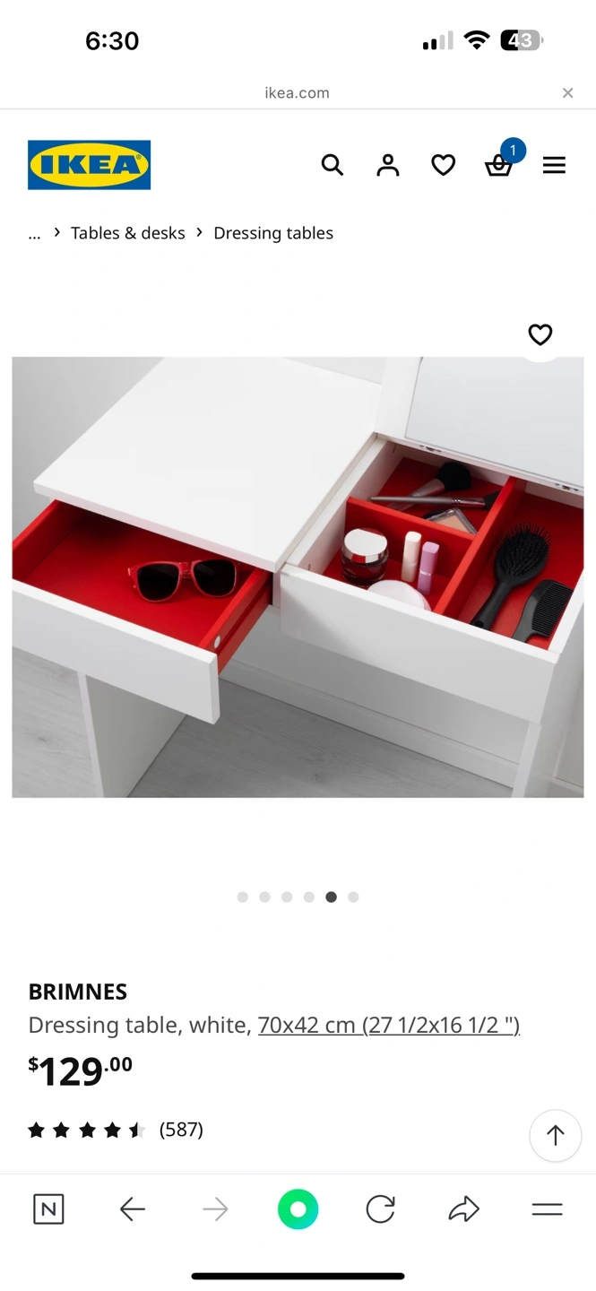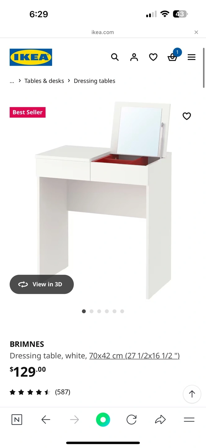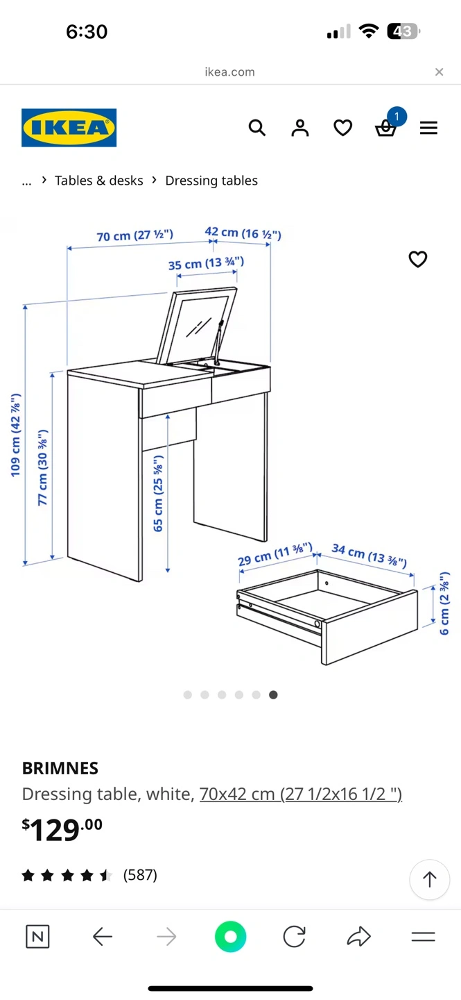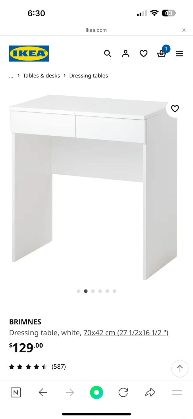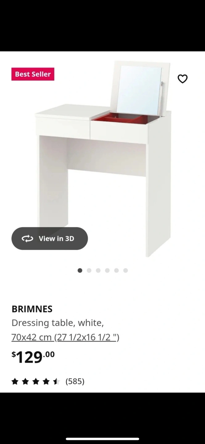 Buy & SellIKEA BRIMNES Dressing Table - WhiteIKEA BRIMNES Dressing Table - White$70White dressing table with two drawers and a flip-up mirror. Excellent condition. Small, perfect for a smaller space. 1year used!ConditionLike newDimensions70 77 42WHERE TO MEETCheck LocationView MapSELLERverifiedloniBayview Village18214 reviews0 chats·0 favorites·3 viewsSEND CHAT TO SELLERHi loni! I’m interested in your listing.Hi loni! I’m interested in your listing.Get the Karrot app to chatSign In to chat