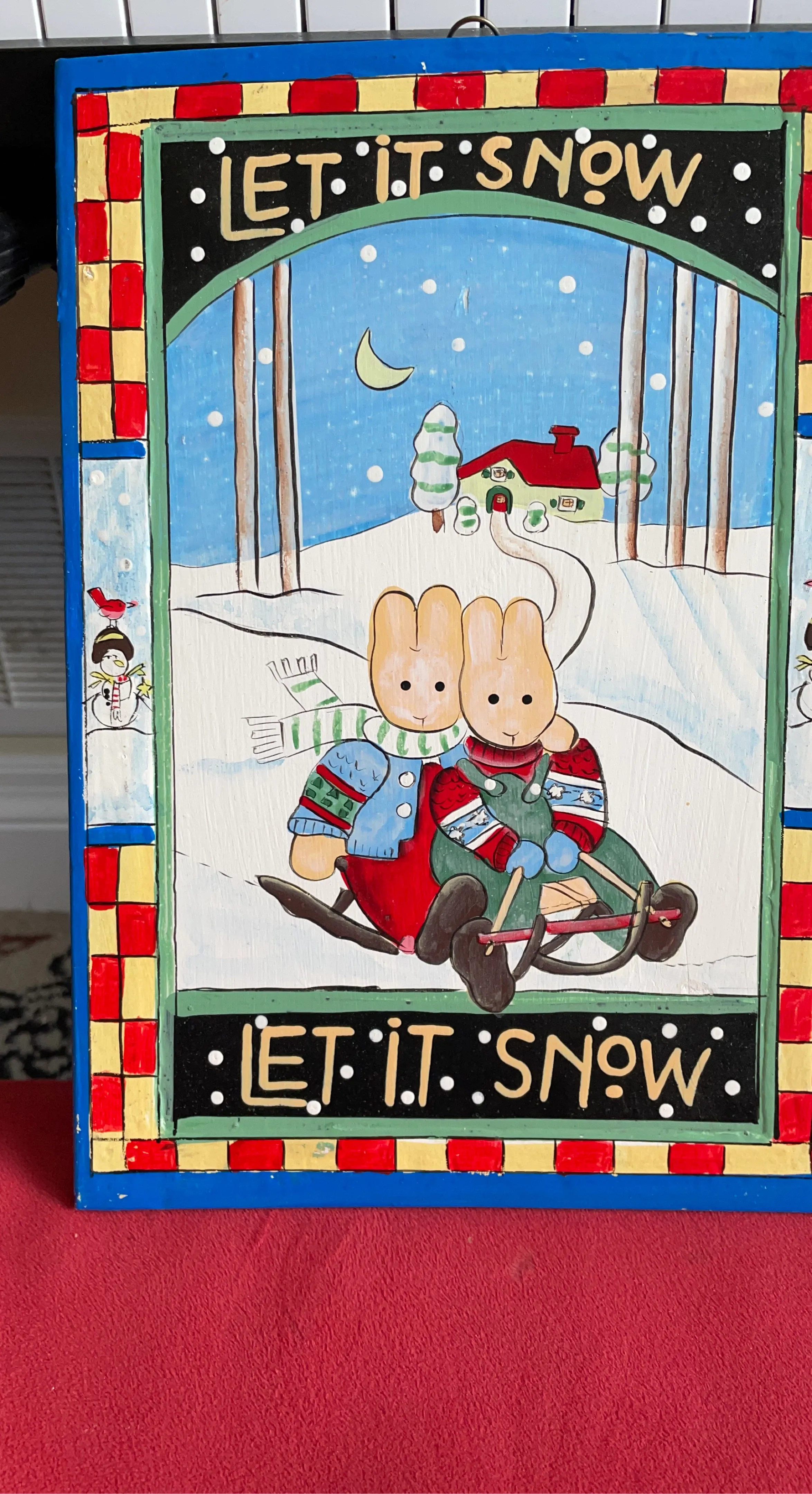 Wooden wall art with a winter scene. Features two bunnies sledding and reads "Let it snow" at the top and bottom. A charming piece for holiday decor!