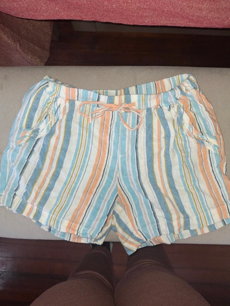 Cute Briggs striped shorts in size small! They have a drawstring waist and are perfect for summer. The colors are a mix of white, blue, peach, and yellow stripes.