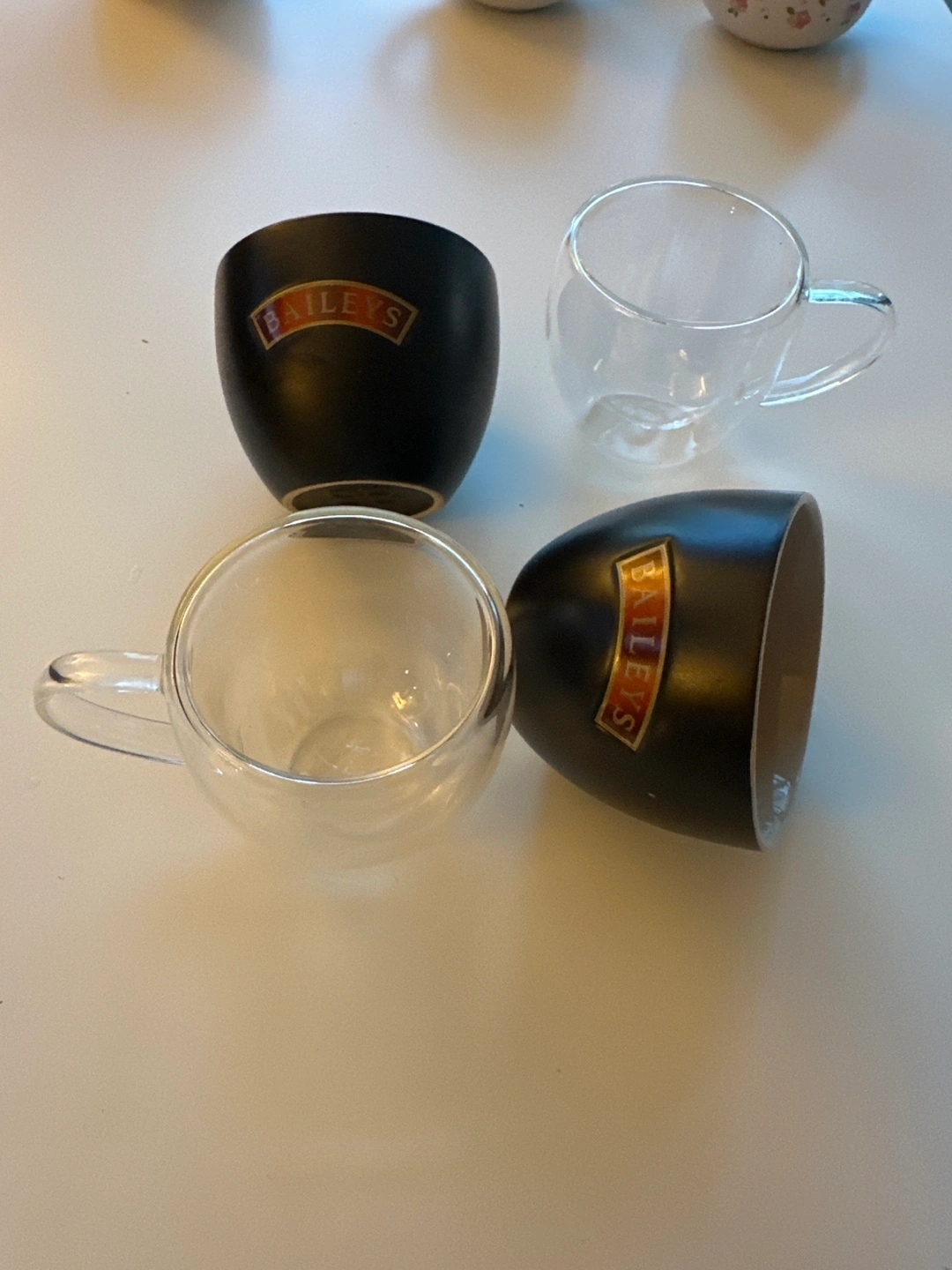 Selling a set of four Baileys coffee mugs! Two are black with the Baileys logo, and two are clear glass with handles. Great for enjoying your favourite Irish cream coffee!