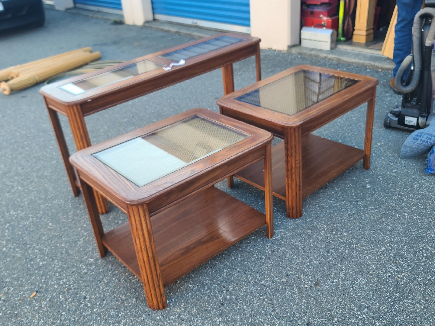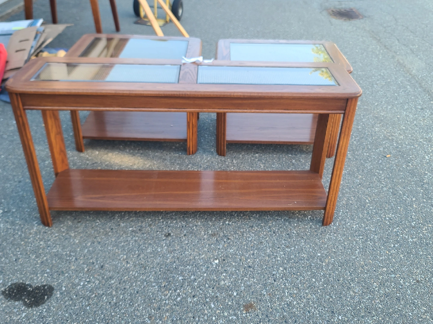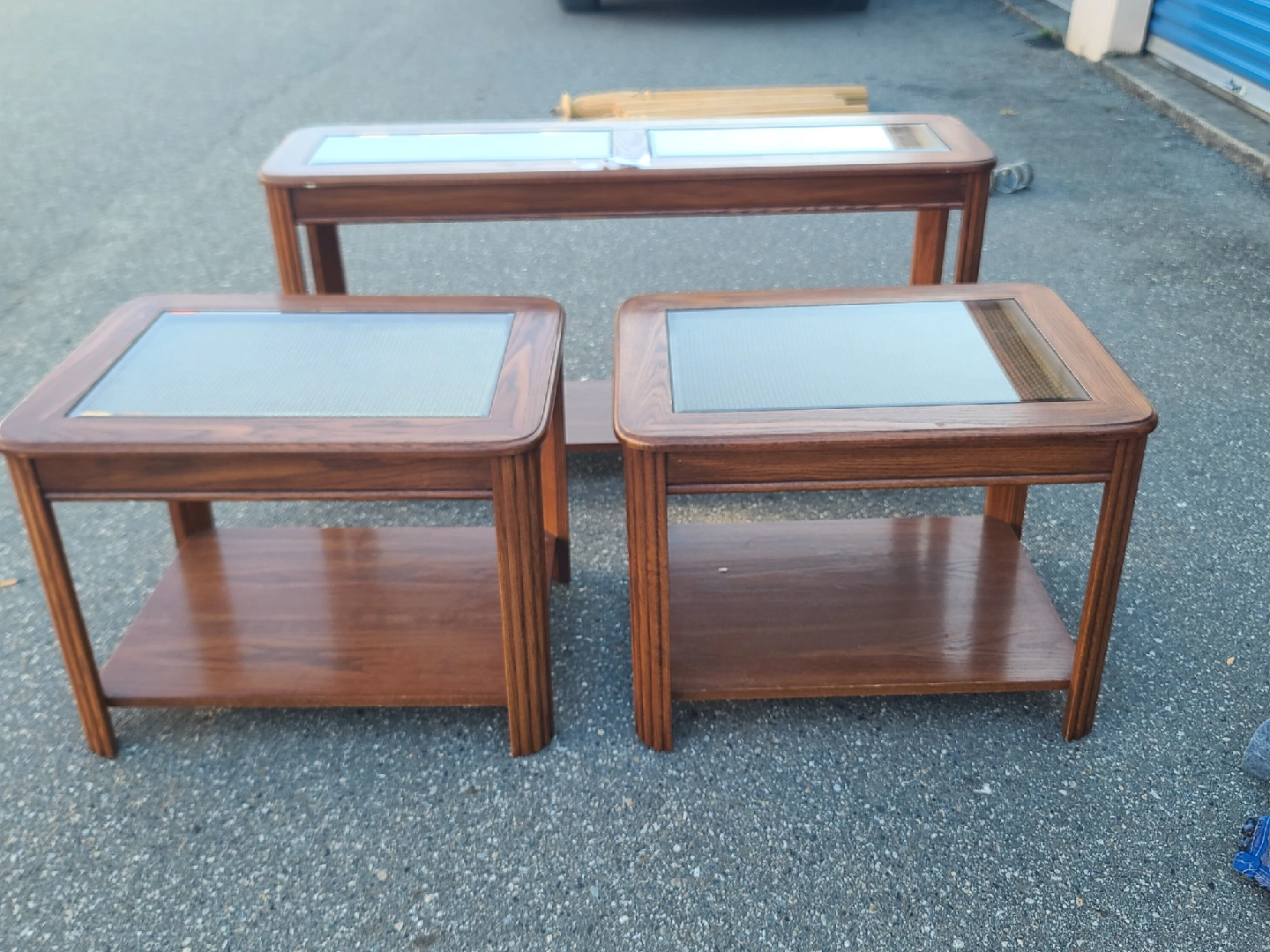 60A set of three tables: a coffee table and two end tables. They feature a classic design with a wood finish and glass tops. Perfect for adding a touch of elegance to your living room. Measurements to follow. Delivery can be arranged. viewing and pickup by appointment.