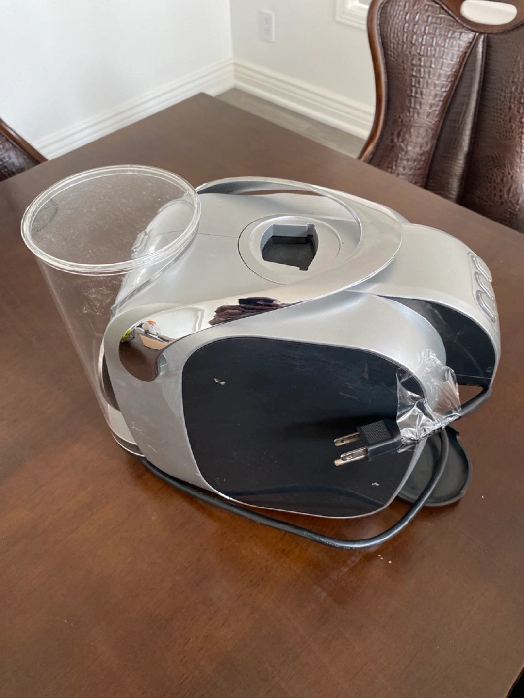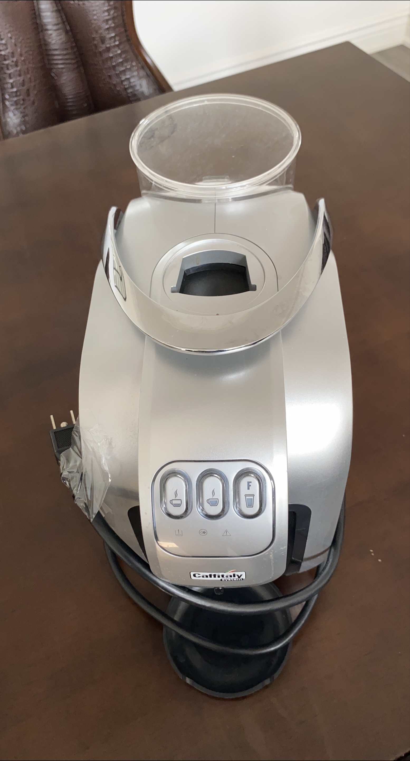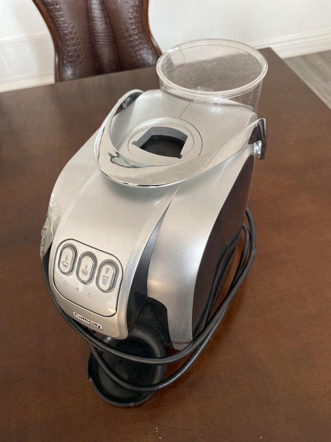 The coffee maker is metallic silver in colour. It has buttons for different coffee types. An attached transparent plastic cup is visible on top. You could use this to unwind after a long day.