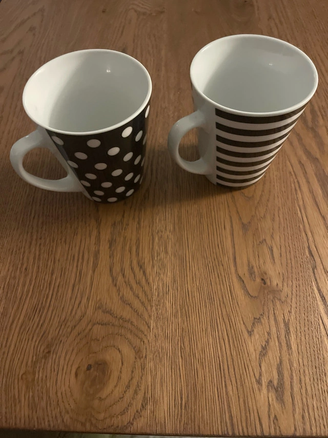 19Here are two used coffee mugs with different patterns, perfect for adding a bit of fun to your morning coffee or tea. One mug features a polka dot design, while the other has a striped pattern, and they are both in good condition. * Designs: Polka Dot, Striped * Condition: Used * Material: Ceramic These mugs are looking for a new home where they can be filled with warm beverages and good cheer. If this ad is still up, then yes, the mugs are still available!