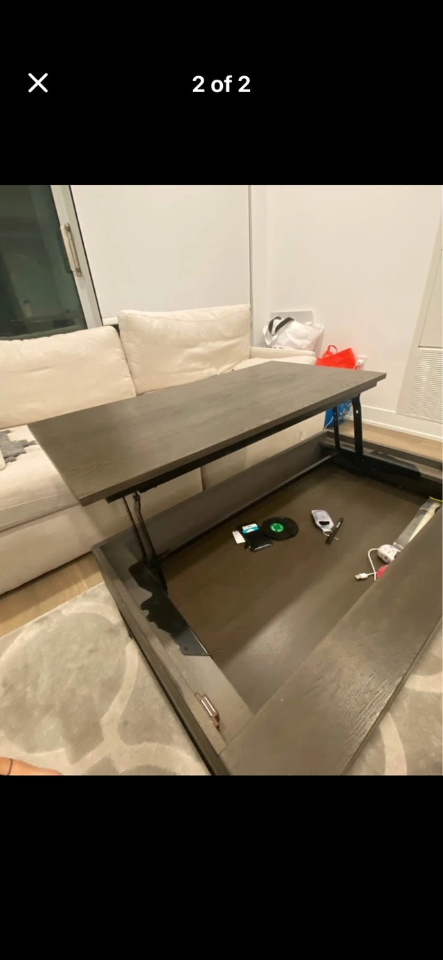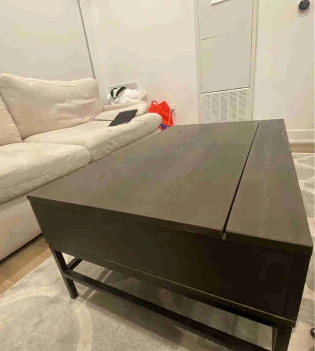 60Coffee table with lift top Brand: Brick Color: dark brown Already assembled Location: Downtown Toronto Condition: Used - Like new For Sale By: Owner Curbside pick up: Yes Cash accepted: Yes Payment: Cashless payment, Cash accepted