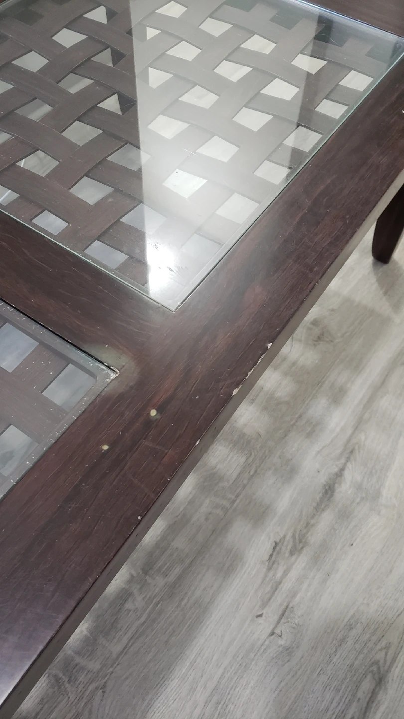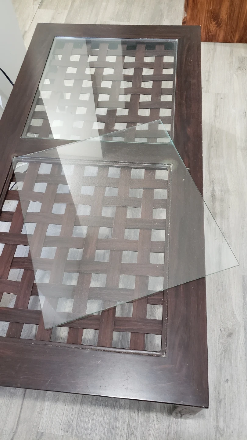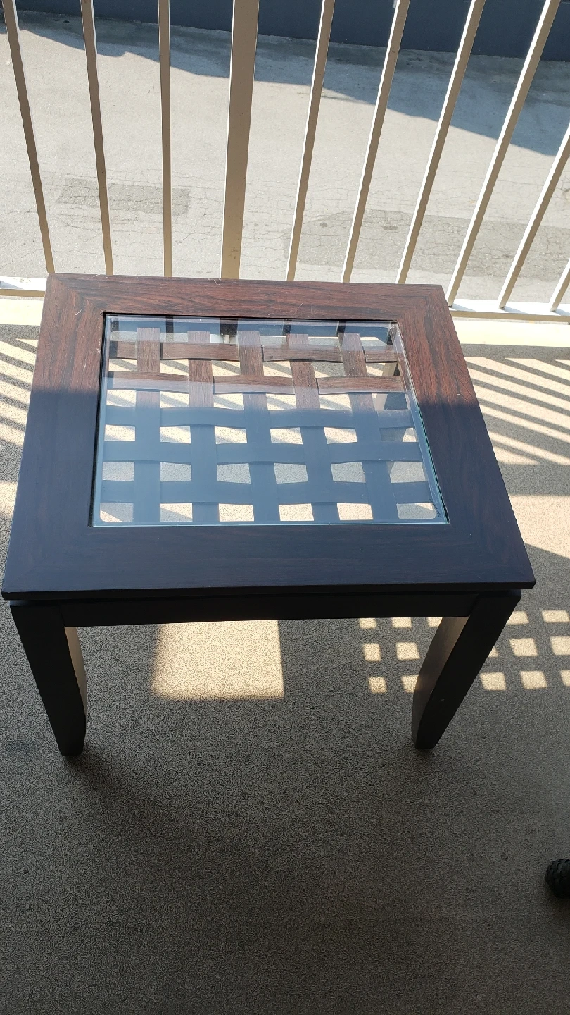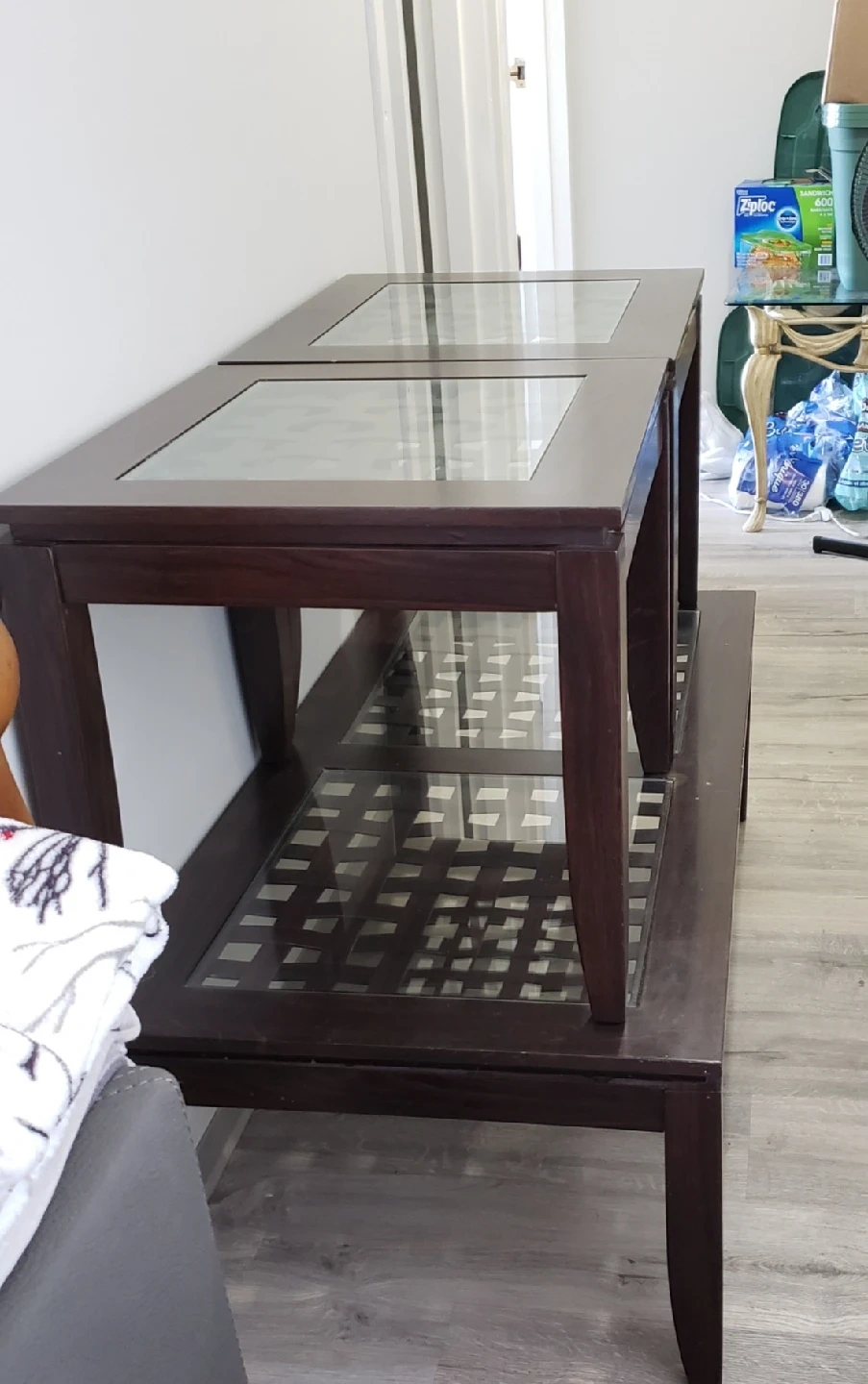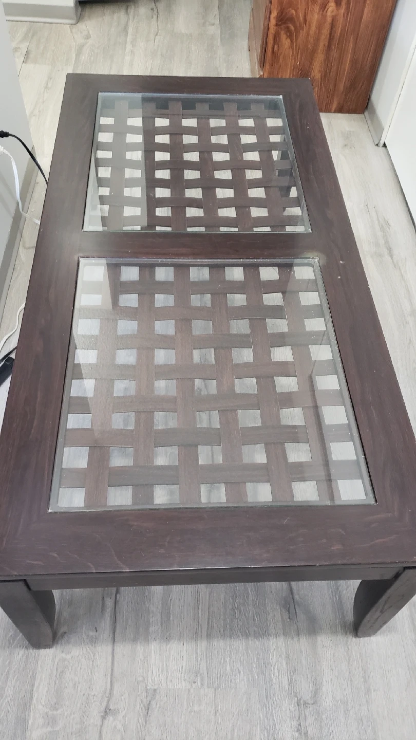 10coffee table and 2 end tables in good condition, chocolate brown color with a weave pattern, tables have a scuff here and there from wear (easy fix with a furniture pen or a sharpie), all glass is in perfect condition and is removable for cleaning. table is 4feet/2feet/16inch tall, end tables are 20inch/22inch/19inch tall.
