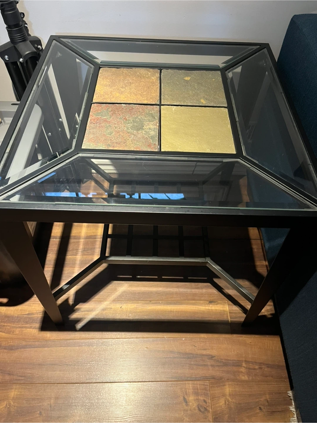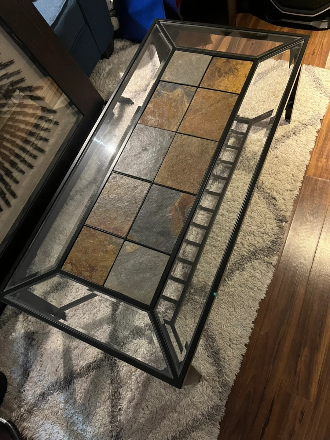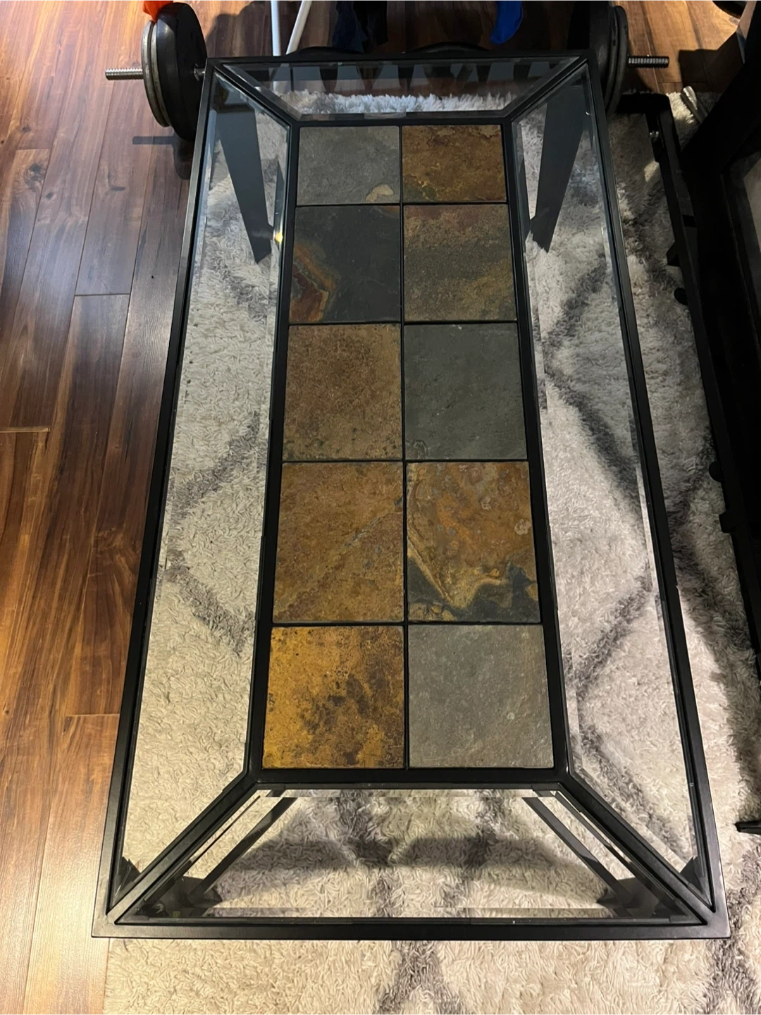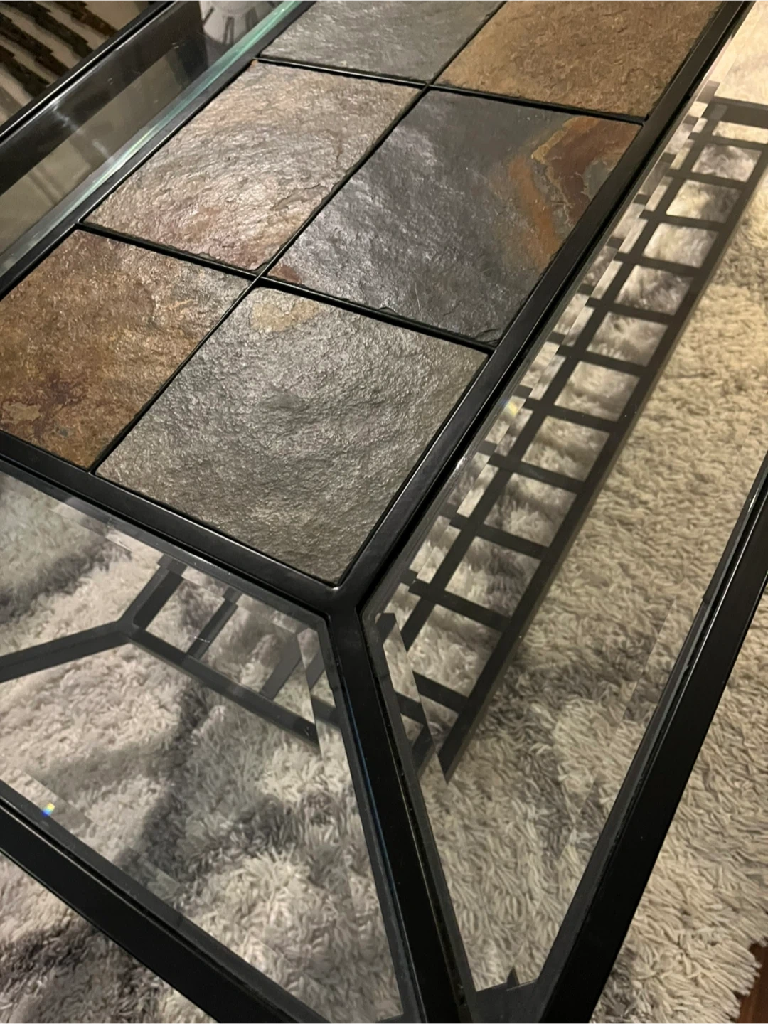 37Here's a coffee table and two end tables with a unique design! It features a glass top with slate tile inserts and a black metal frame. It's in great condition and would be a stylish addition to any living room. CAN DELIVER WITHIN DURHAM REGION Dimension: Coffee table 48” x 24” x 17.5” height End tables 24” x 24” x 23” height