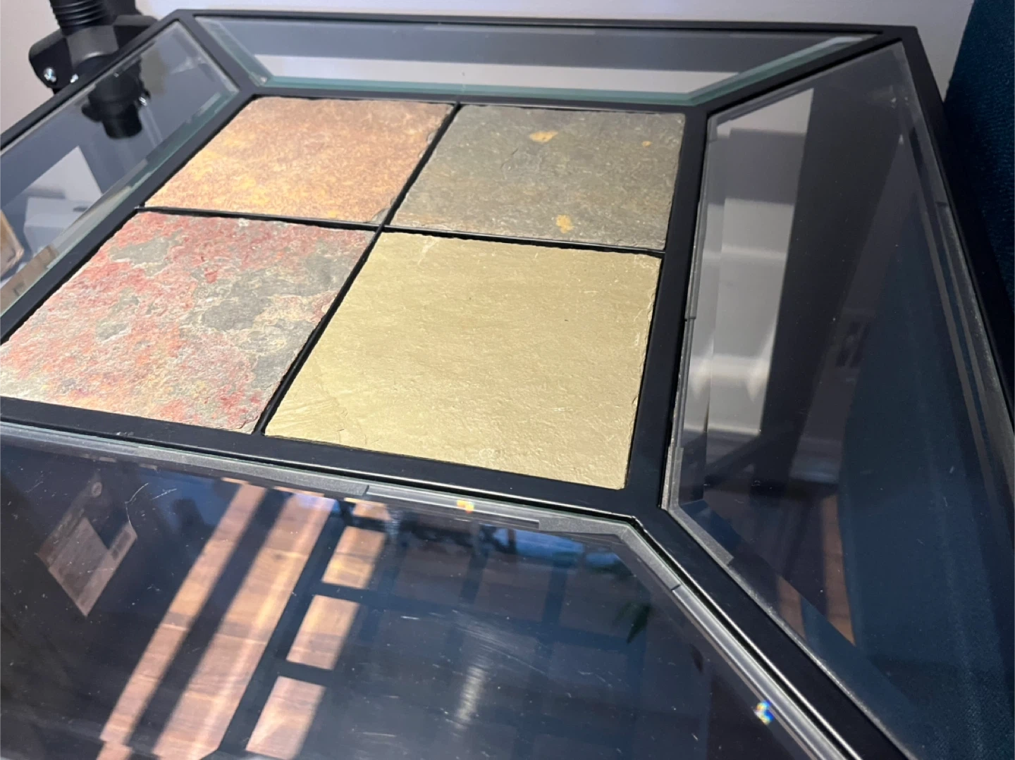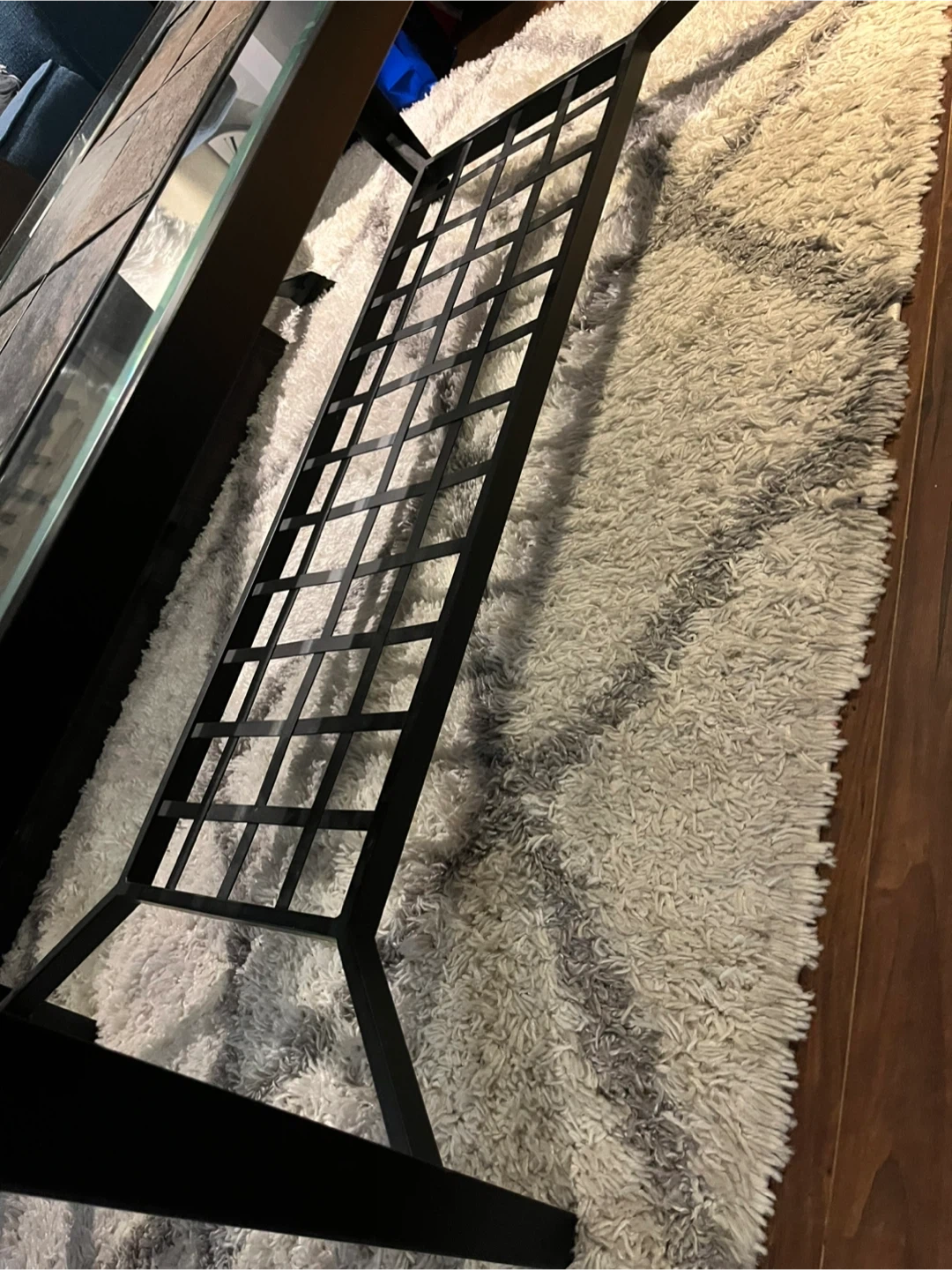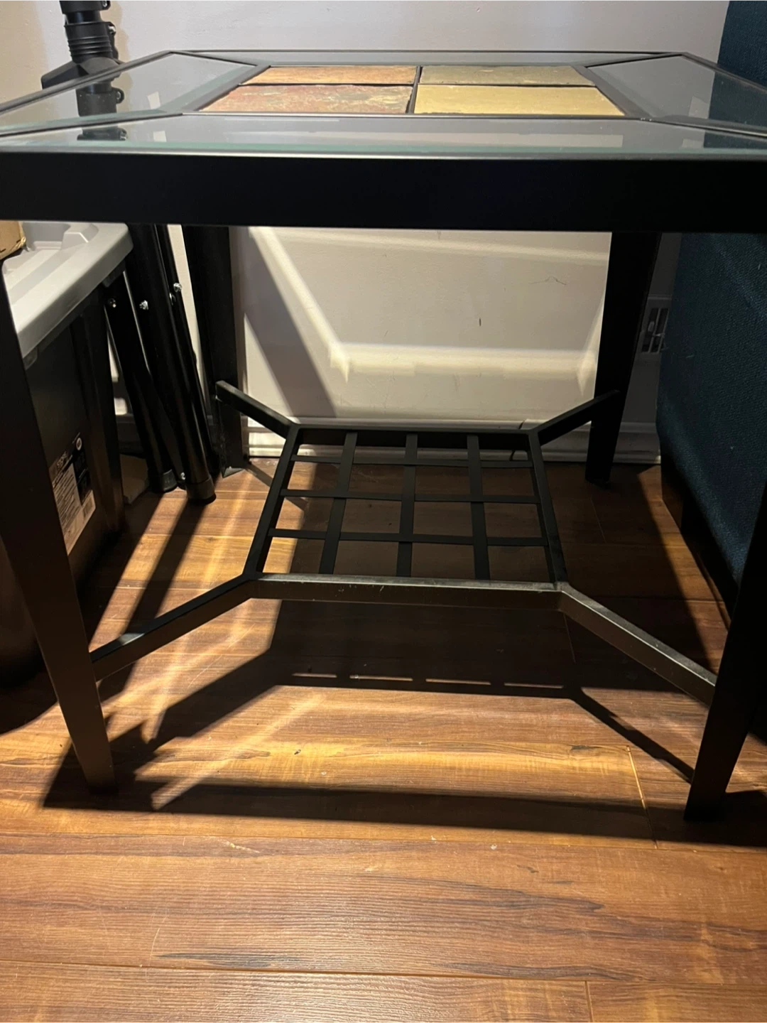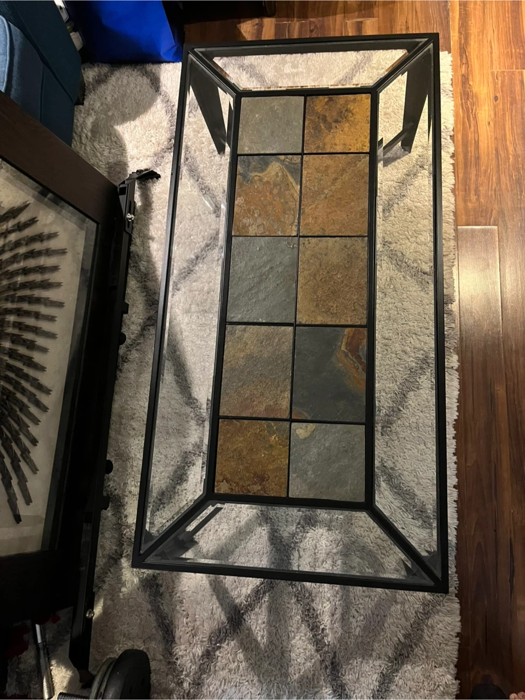 37Here's a coffee table and two end tables with a unique design! It features a glass top with slate tile inserts and a black metal frame. It's in great condition and would be a stylish addition to any living room. CAN DELIVER WITHIN DURHAM REGION Dimension: Coffee table 48” x 24” x 17.5” height End tables 24” x 24” x 23” height