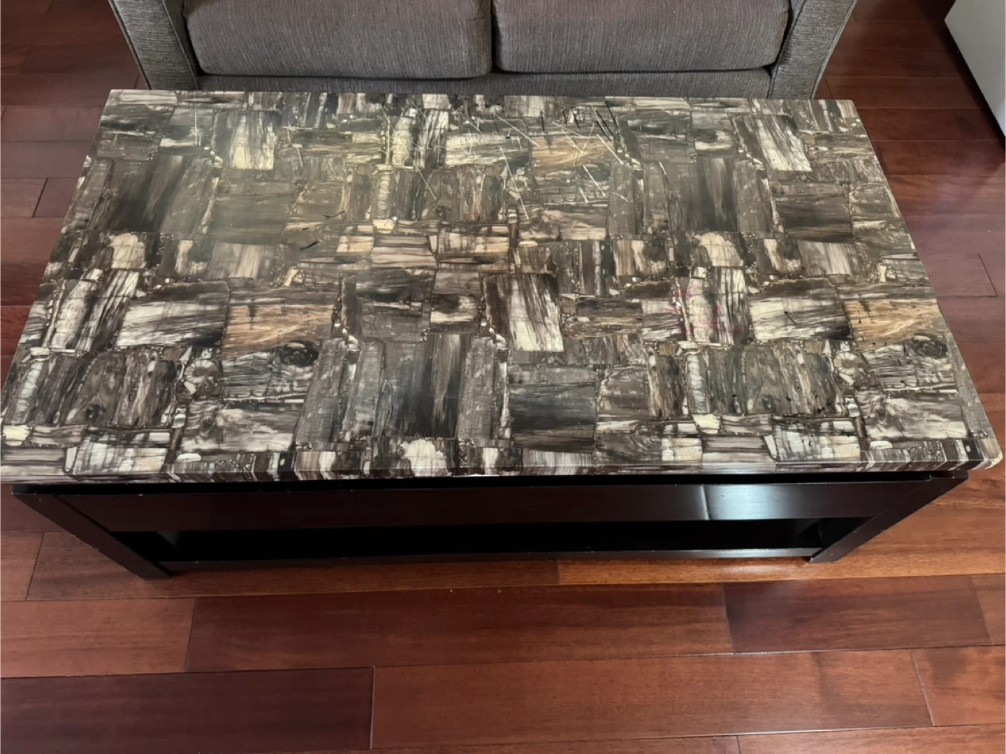 Coffee table with a unique stone-like top and a dark wood frame. It also features a lift top with storage underneath, perfect for keeping things tidy and out of sight. Great for any living room!