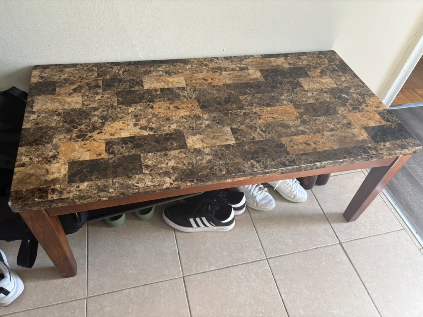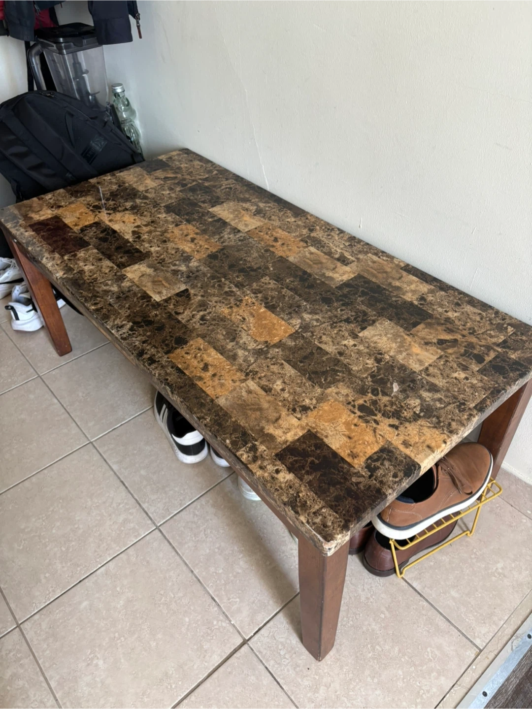 Selling a coffee table with a unique marble-look top! It's in good condition and would be a great addition to any living room. The table has a sturdy base and is perfect for placing books, magazines, or your favourite cup of coffee *PICK UP ONLY*