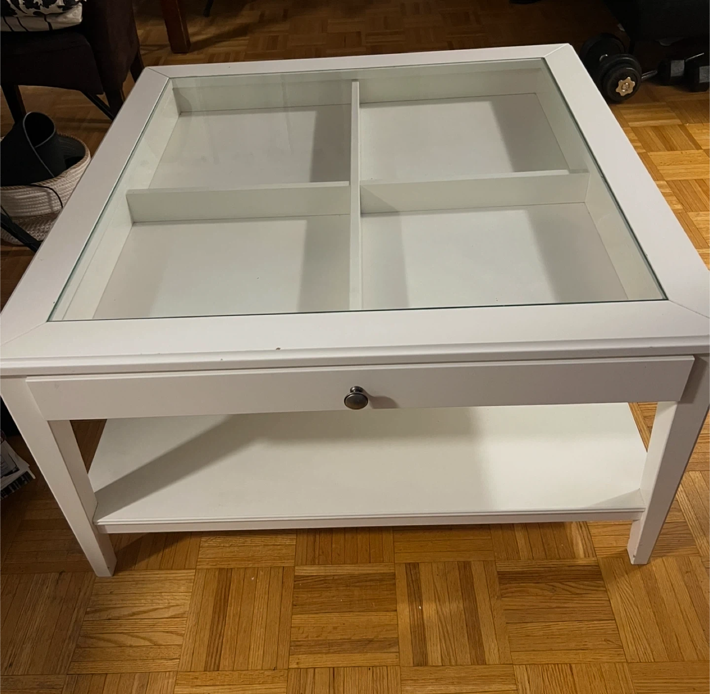 59Stylish square coffee table featuring a sturdy frame, a sleek glass top, and a convenient storage drawer. It’s in great condition with minimal signs of use. Perfect for adding a modern touch to any living room while keeping essentials like remotes or magazines neatly stored away. Details: Square design with clear glass top Built-in drawer for extra storage Solid construction, very stable