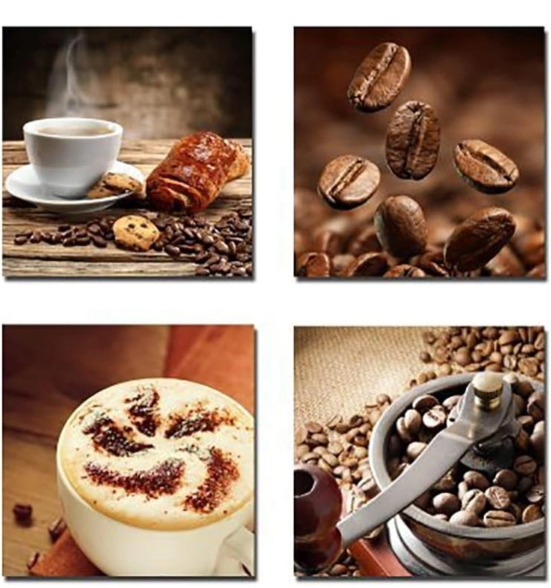 Four-piece canvas print set. Coffee, croissants, beans, and a grinder featured. Square shape. Ready to hang. Perfect for kitchen, dining room, or office. each 10$