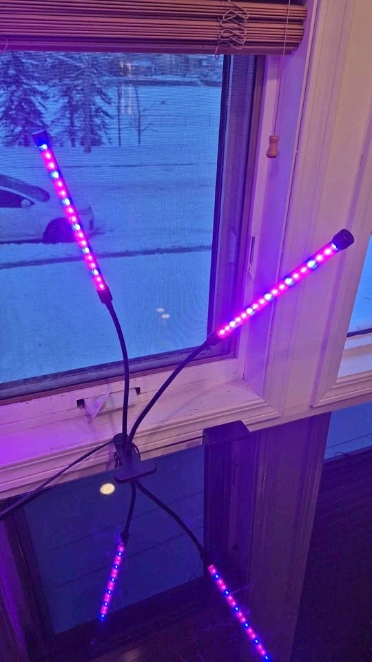 Bright LED grow light with two adjustable gooseneck arms and a handy clip for easy attachment. Control panel has timing options, brightness, and single or dual light settings. Wall adapter included.