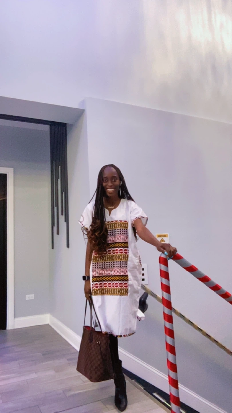White tunic dress with colorful African print panel. Short sleeves and side pockets. Comfortable and stylish, this dress is great for casual wear or special occasions. Cotton blend material.