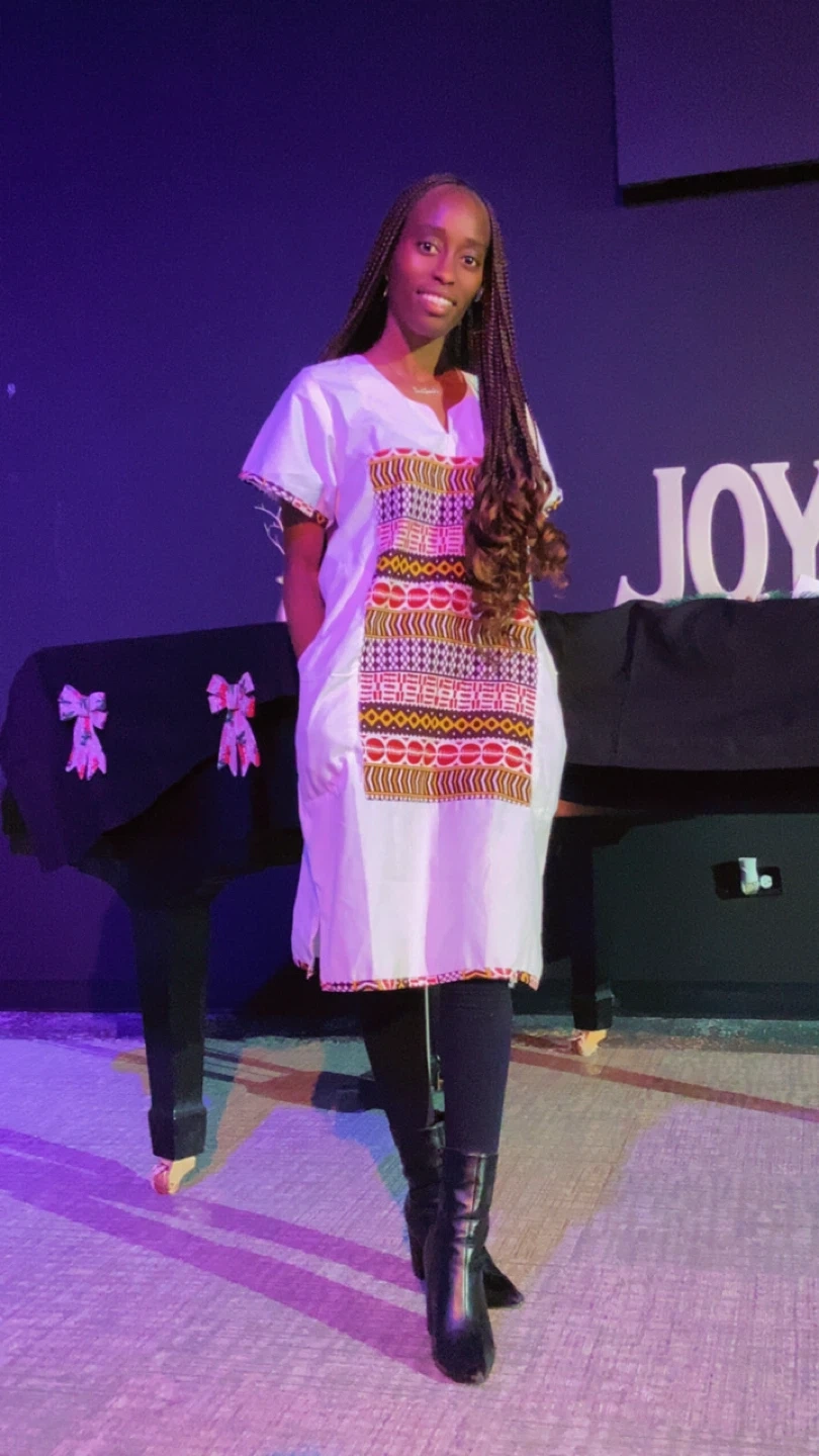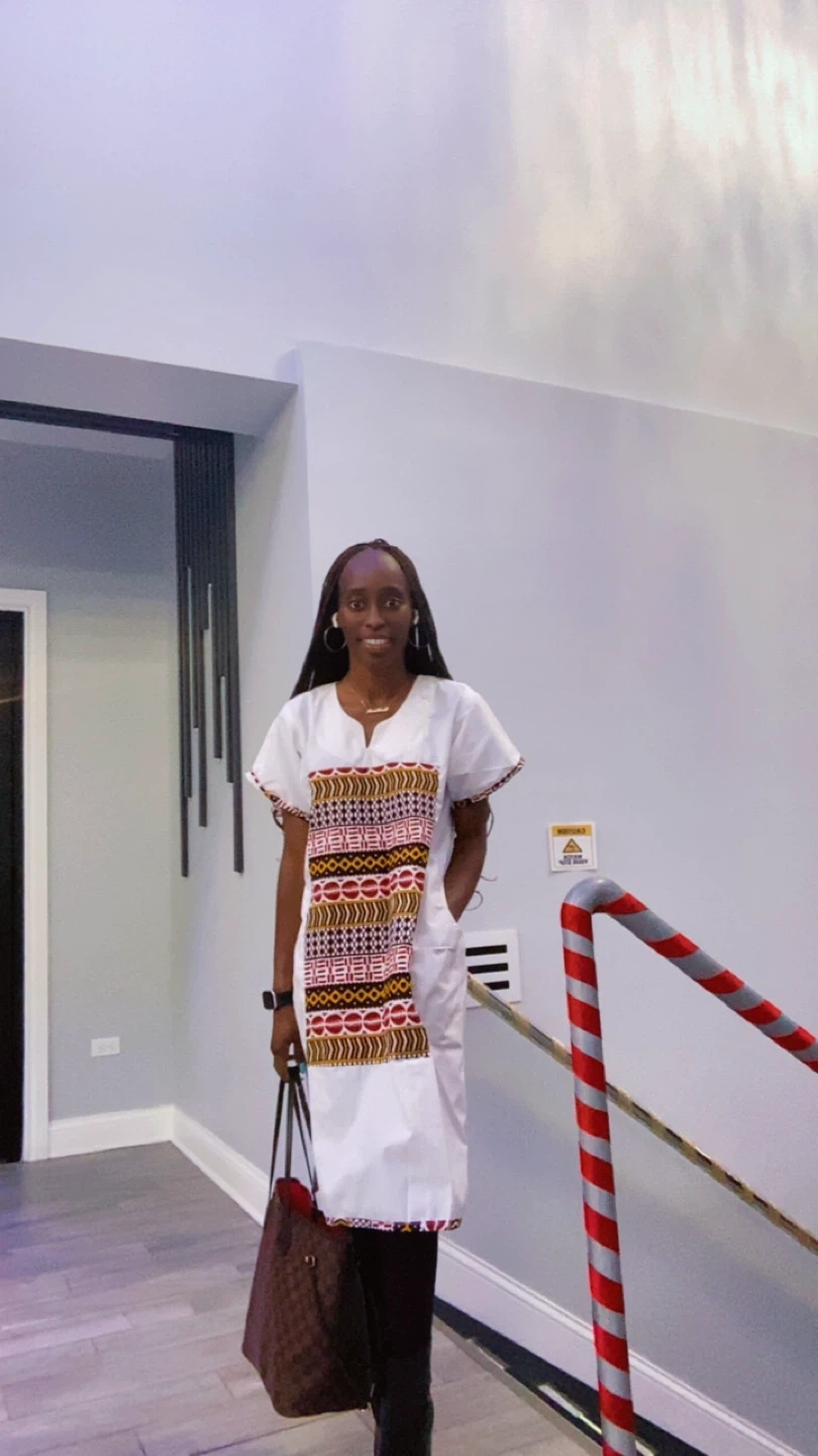 White tunic dress with colorful African print panel. Short sleeves and side pockets. Comfortable and stylish, this dress is great for casual wear or special occasions. Cotton blend material.