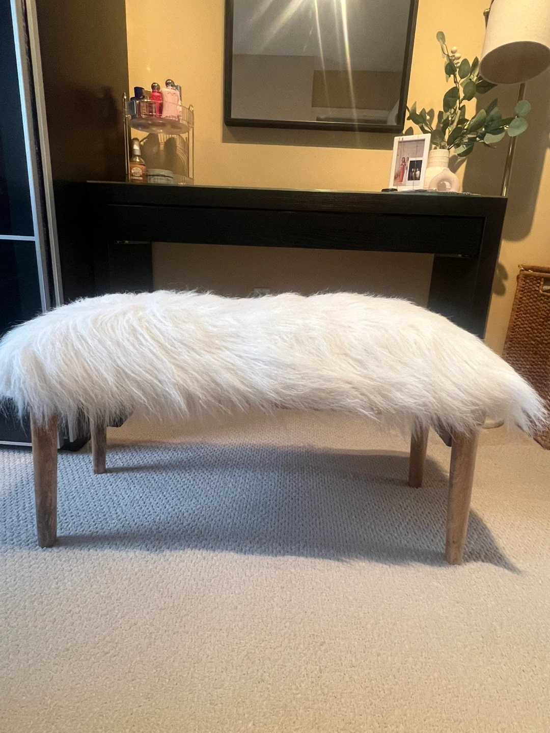 Selling a cute faux fur bench with wooden legs. It's in great condition and would be a lovely addition to any room! Perfect for extra seating or as a decorative piece.