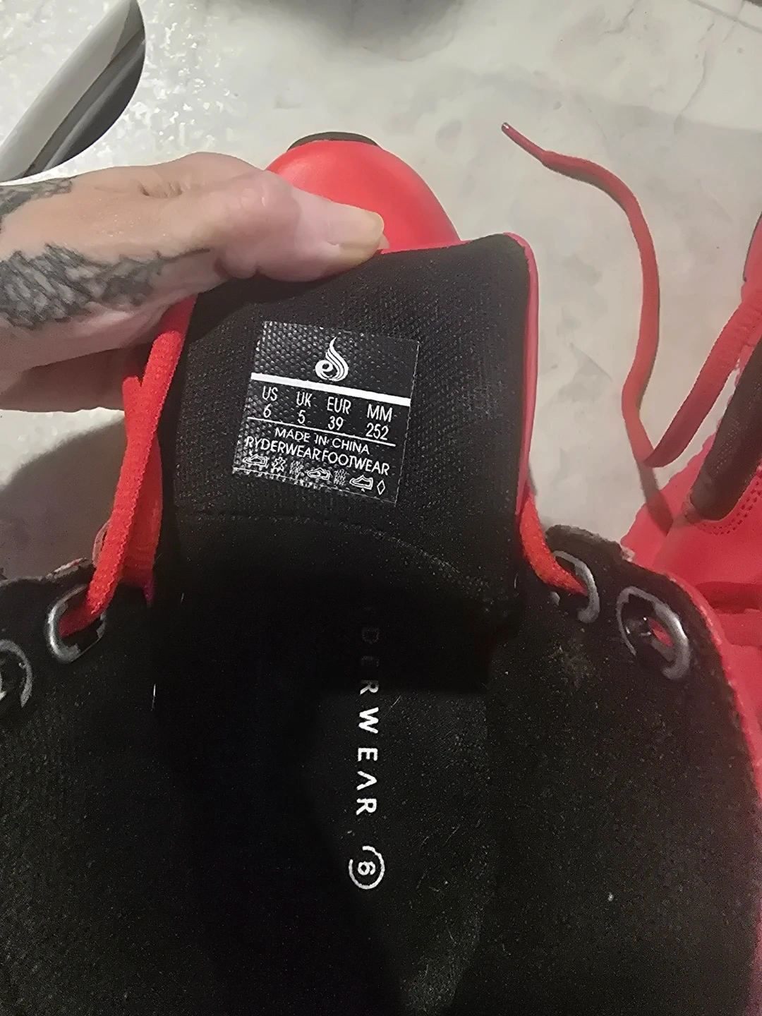 Ryderwear red high-top training shoes. US Size 6, UK 5, EUR 39, MM 252. Made in China. Features a durable rubber sole. Worn a handful of times indoors only.