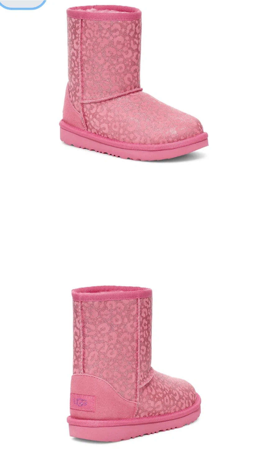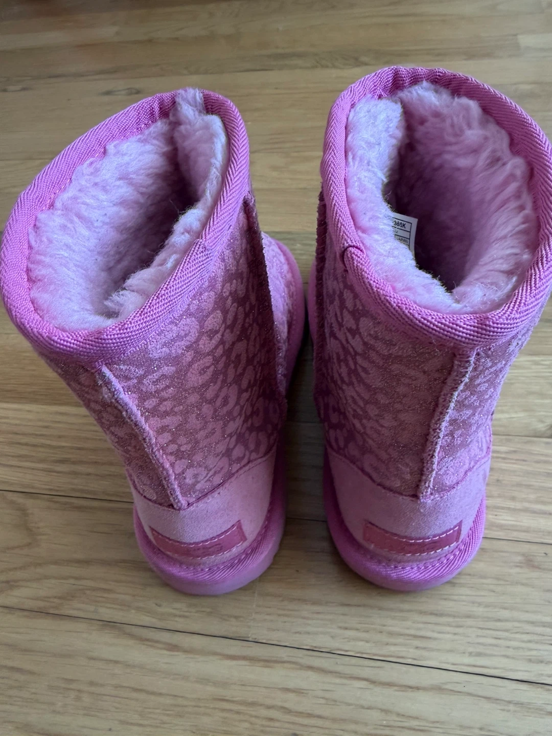 These are Ugg Classic Short boots in a fun pink leopard glitter design. They're perfect for keeping little feet cozy and stylish. Big kids size 1.