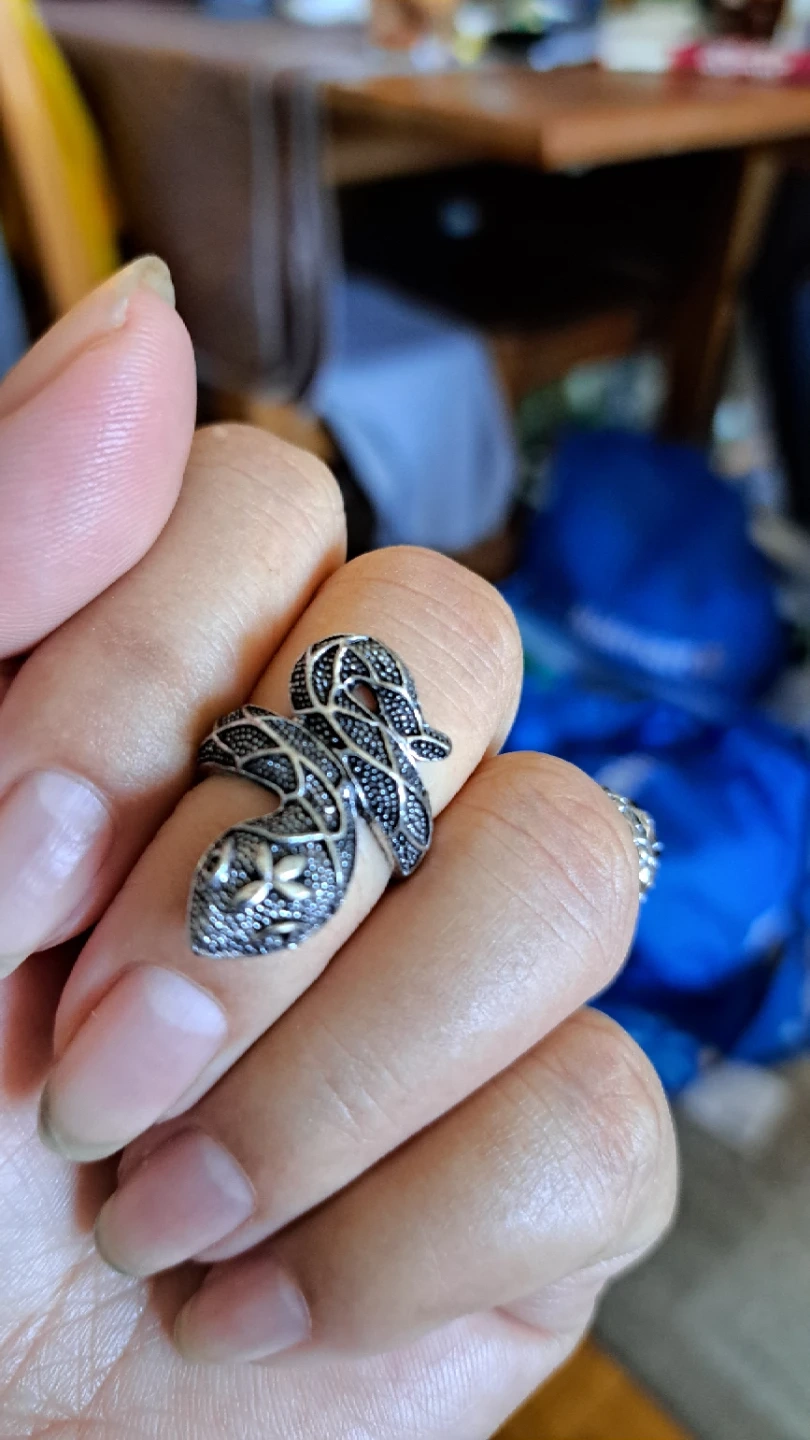 This ring is designed in the shape of a coiled snake. It has an intricate, textured pattern all over. It's a unique accessory for your collection!