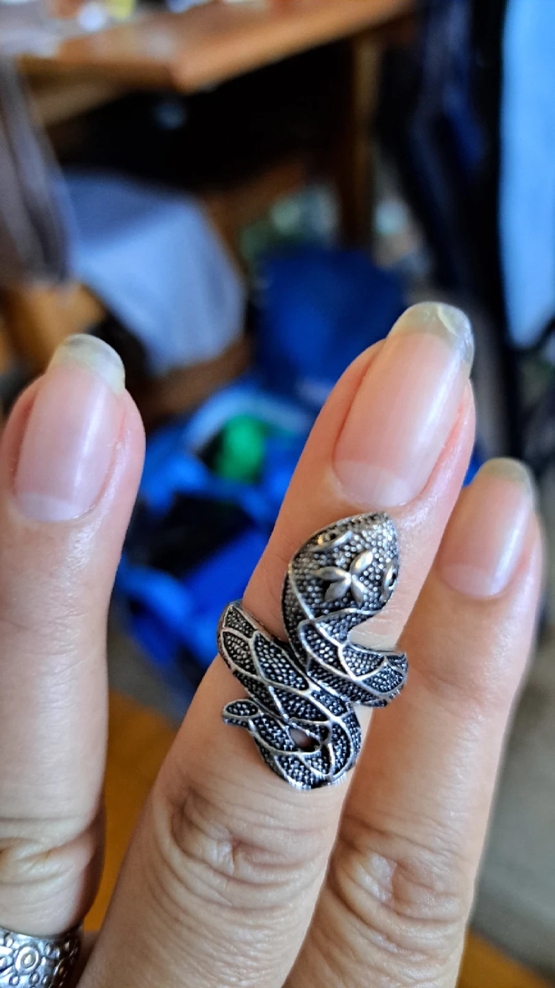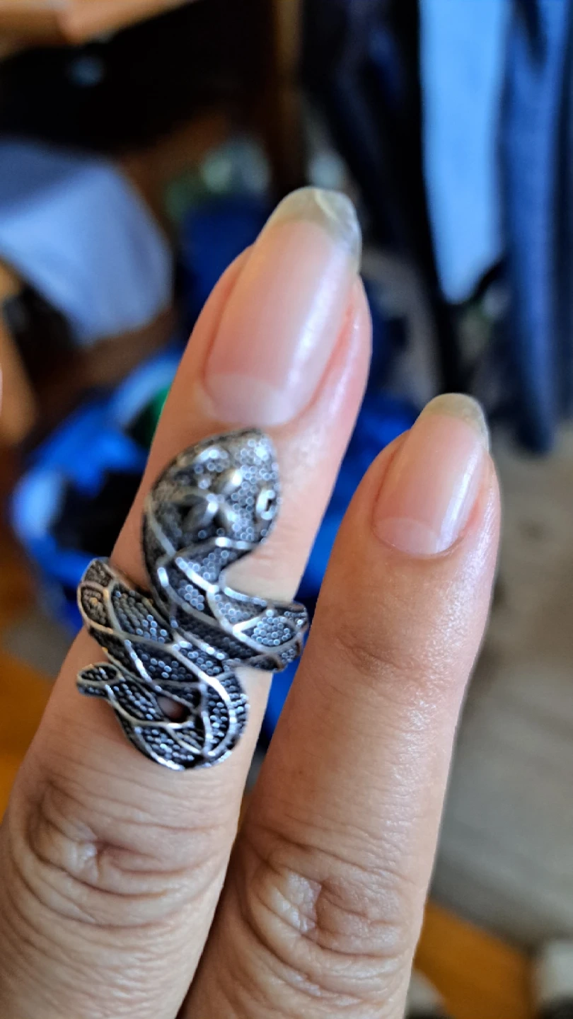 This ring is designed in the shape of a coiled snake. It has an intricate, textured pattern all over. It's a unique accessory for your collection!