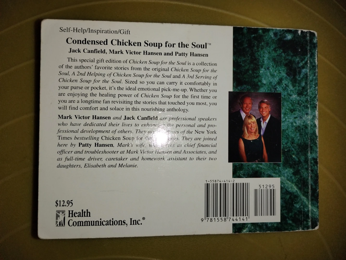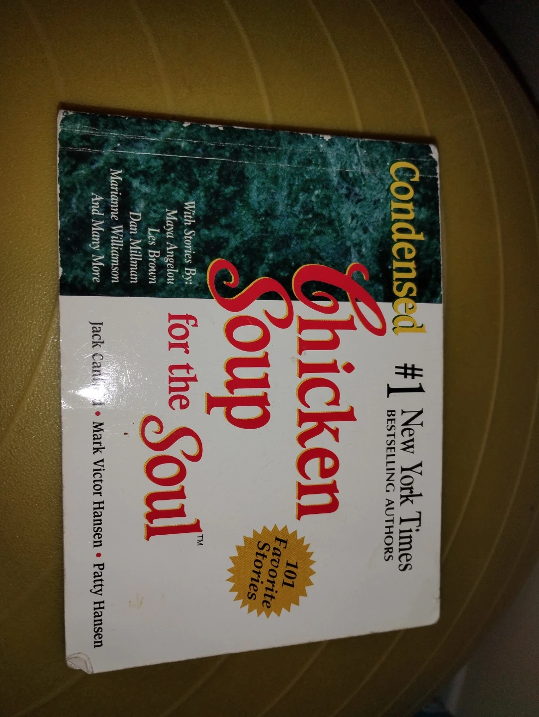 Selling a copy of Condensed Chicken Soup for the Soul by Jack Canfield, Mark Victor Hansen, and Patty Hansen. It's a collection of favorite stories from the original Chicken Soup for the Soul. Sized so you can carry it comfortably in your purse or pocket, it's the ideal emotional pick-me-up. Originally bought for $12.95