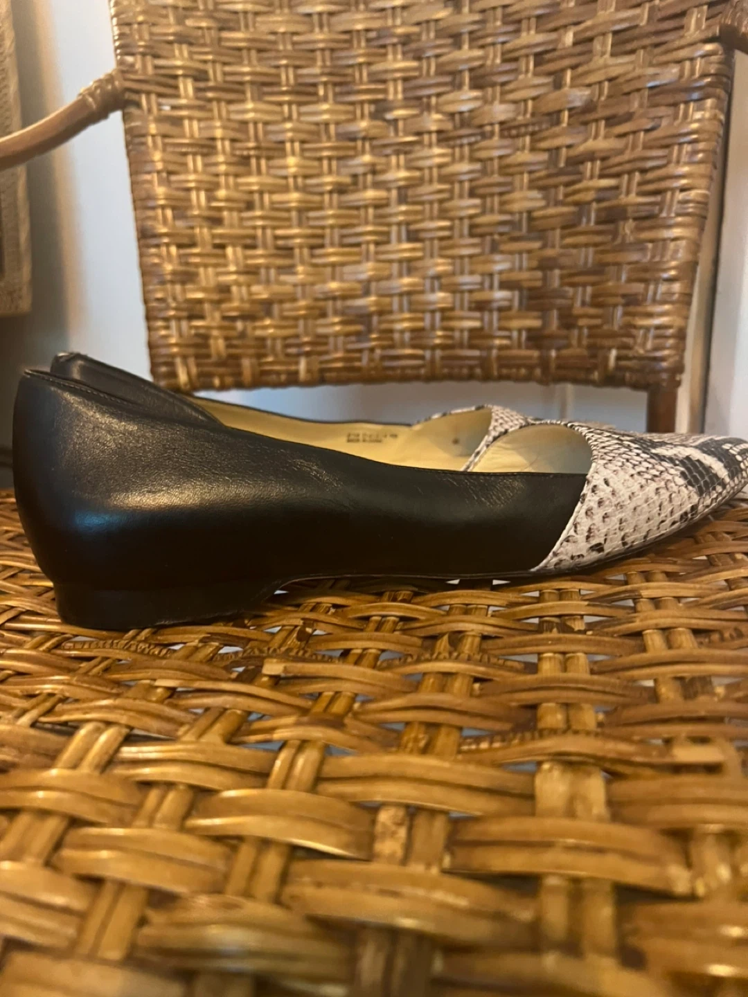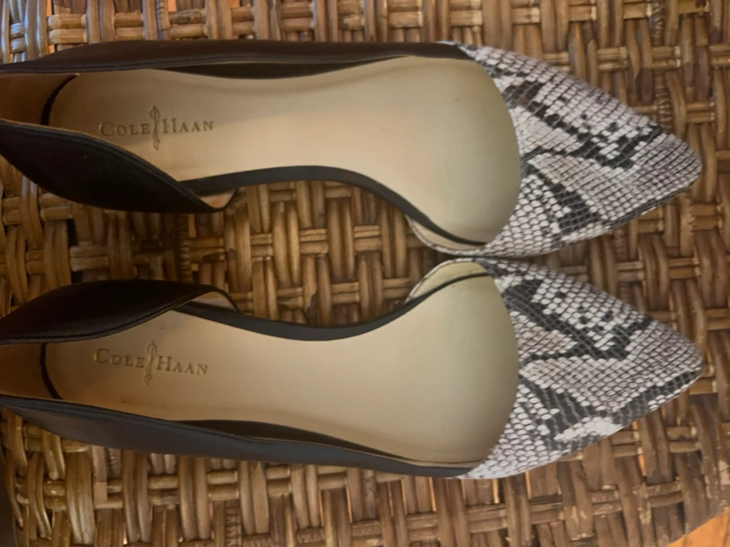 18These Cole Haan flats are a stylish addition to any wardrobe! They feature a sleek black leather body with a snakeskin print toe. Size 8.5 US.