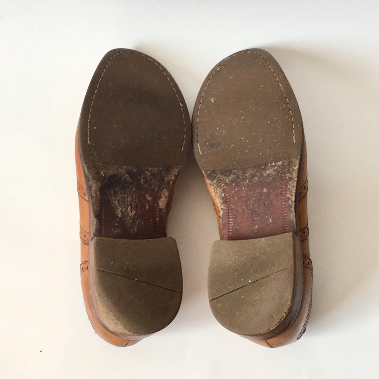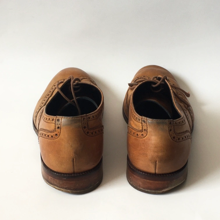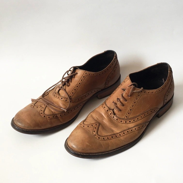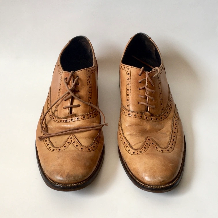 40lightly used pair of british tan wingtips in decent condition. fully leather from the soles to the uppers. light scuffs from age and wear. size 9.5